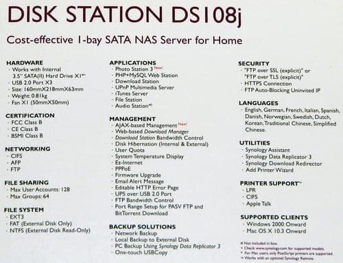 В полной мере осознавая потребности стесненных в средствах да и просто экономных пользователей, Synology этим летом специально выпустила упрощенный вариант однодискового NAS: модель Disk Station DS108j на момент написания статьи предлагается в московской рознице примерно в 5000 руб. (без диска), что можно назвать достаточно привлекательным предложением, поскольку явно конкурентоспособно по отношению к самодельным (из старого ПК) NAS и по цене, и тем более по размерам и внешнему виду.