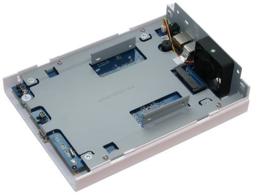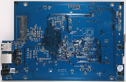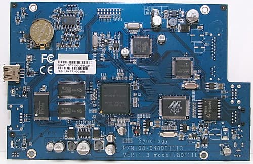 Внутри станина для винчестера и материнская плата, дополняющие всегдашнее впечатление от изделий Synology — добротность и продуманность. C обратной стороны плата практически пустая.