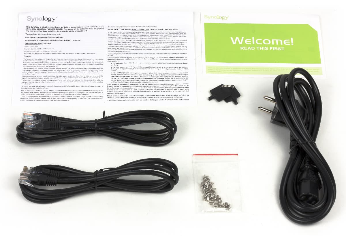 Накопитель поставляется в строгой картонной коробке, которая, несмотря на свои достаточно большие размеры и массу (более 4 кг), имеет пластиковую ручку для переноски. Комплектация стандартная — кабель питания, два сетевых кабеля, комплект винтов для крепления дисков 2,5″, два ключа для защелок дисковых отсеков, краткая инструкция.