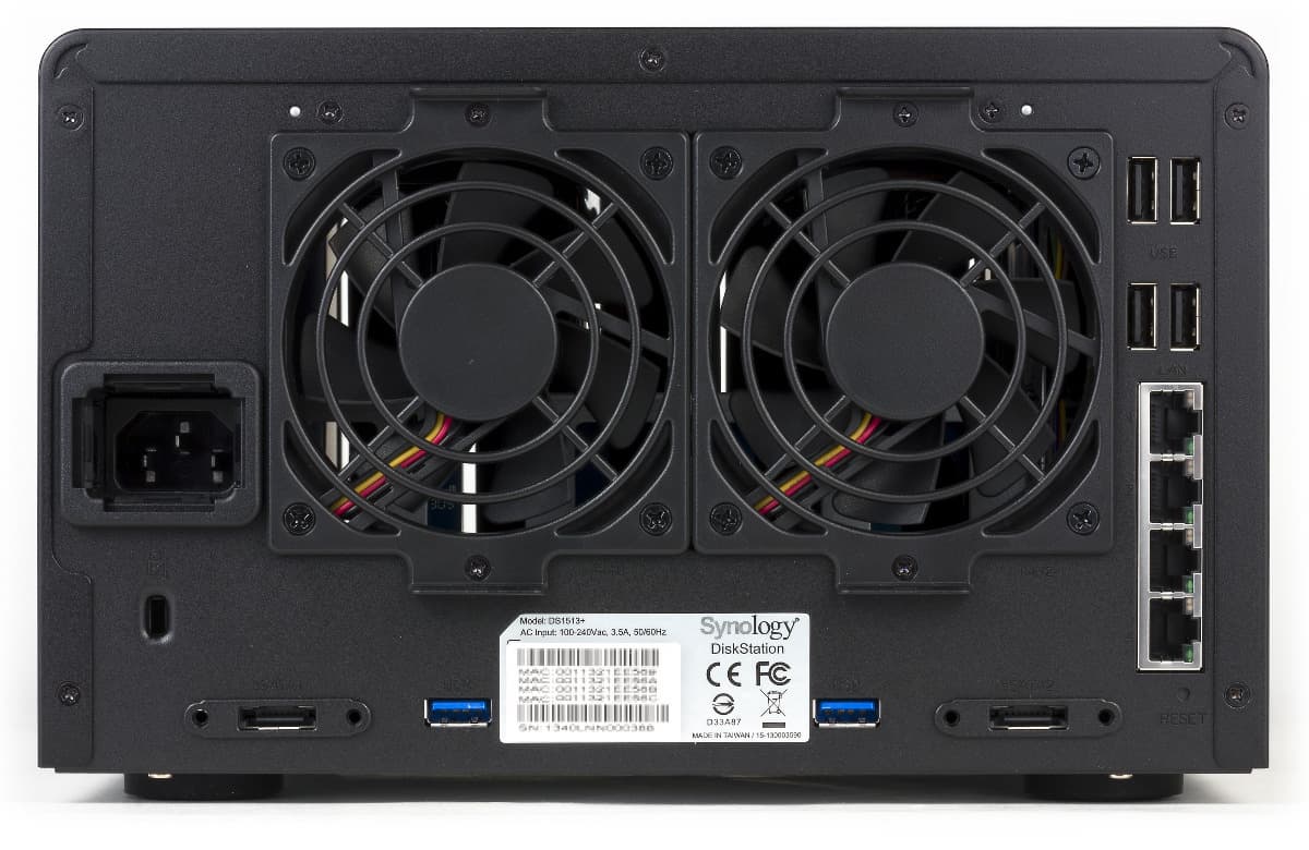 Модель DS1513+, которая будет рассмотрена в этой статье, может похвастаться штатными 2 ГБ оперативной памяти (возможно расширение до 4 ГБ) и сразу четырьмя гигабитными сетевыми интерфейсами. Что касается портов расширения, то их состав не изменился относительно прошлогодней модификации — 4×USB 2.0, 2×USB 3.0, 2×eSATA.