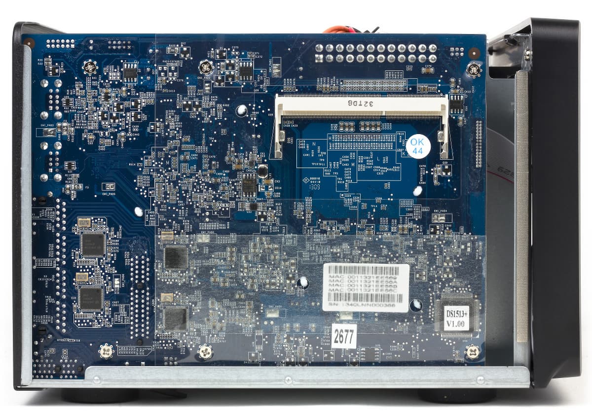 На левой стенке рамы находится основная печатная плата накопителя. На ней установлен процессор Intel Atom D2701 (x64, 2C4T, 2,13 ГГц), чипсет Intel ICH10R, два слота SODIMM (в одном, внутреннем, уже стоит модуль на 2 ГБ). В системе используются гигабитные сетевые контроллеры Intel I210-AT, контроллер EtronTech EJ168A на два порта USB 3.0 и контроллер Silicon Image Sil3132 для реализации двух портов eSATA. Первоначальная загрузка осуществляется со специального накопителя объемом 128 МБ с интерфейсом USB, подключенного прямо на основную печатную плату.