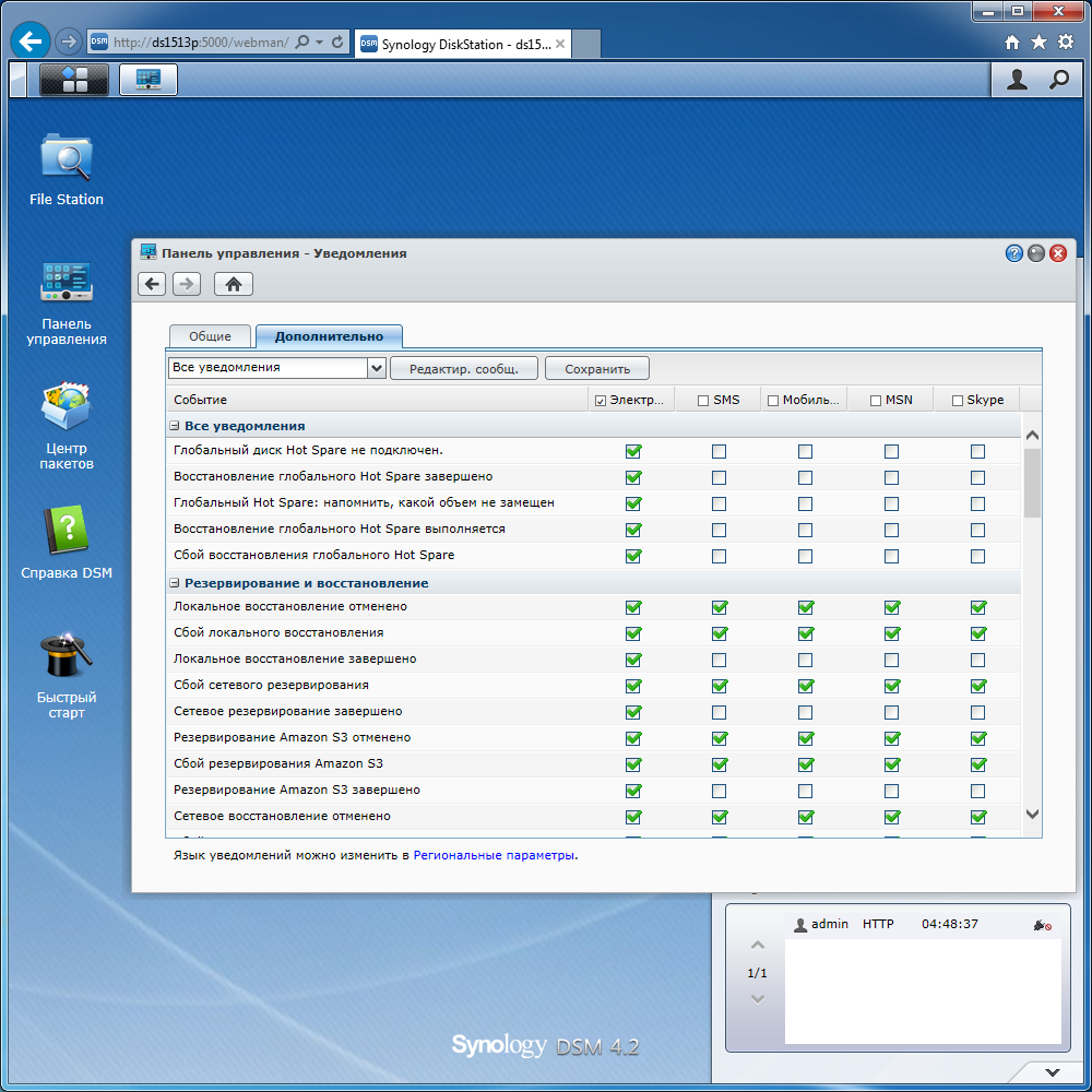 Для информирования администратора о работе накопителя можно использовать несколько вариантов коммуникаций: электронная почта, SMS, Push-сервисы для смартфонов, Skype и Windows Live Messenger. При этом гибко настраивается назначение типов уведомлений способам сообщения.