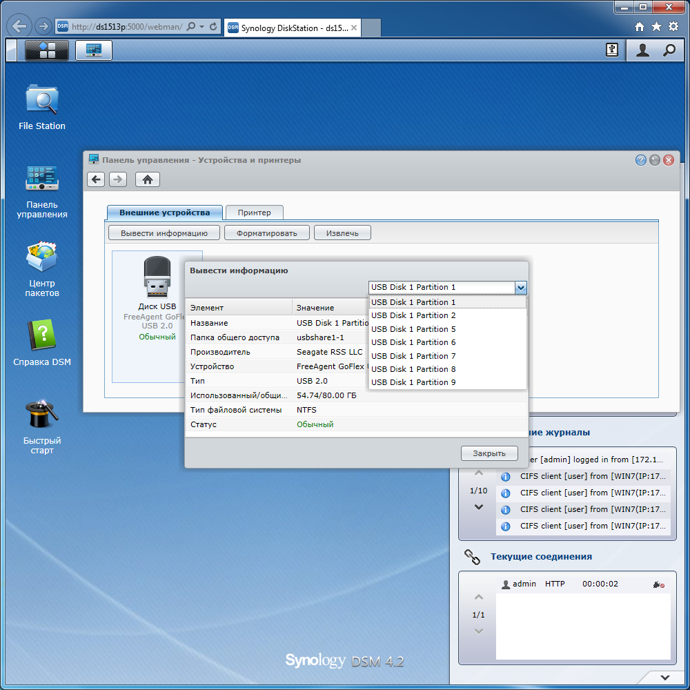 Причем возможности по организации внешних дисков в массивы аналогичны внутренним винчестерам. В web-интерфейсе есть возможность безопасного отключения дисков и форматирования.