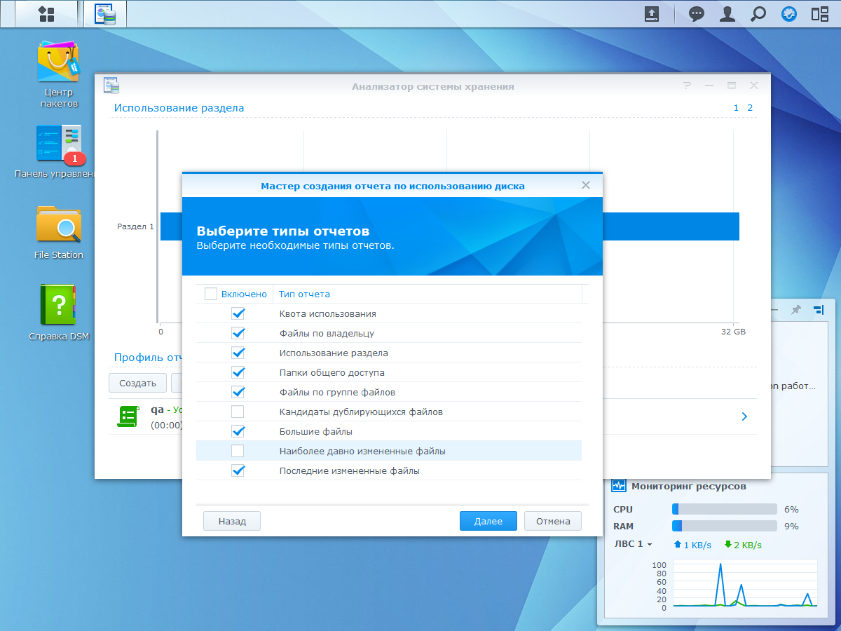 В разделе «Информационный центр» предоставляются системные данные о сетевом накопителе, текущий статус устройства, дисковых томов, сетевых интерфейсов и служб. Встроенный планировщик позволяет автоматизировать некоторые задачи и отчеты, а также управлять работой служб по расписанию.