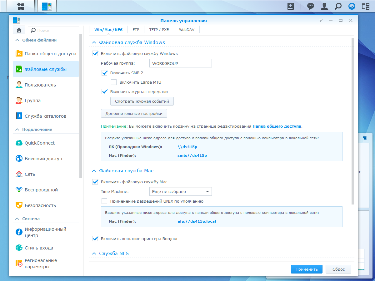 Доступ к файлам осуществляется по протоколам SMB/CIFS, AFP, NFS, FTP и WebDAV, что позволяет работать с сетевым накопителем практически с любого современного электронного устройства, а также через интернет. Предусмотрено использование и File Station — многофункционального менеджера файлов в браузере. В ней, в частности, есть работа с архивами, создание ссылок быстрого доступа и подключение образов ISO.