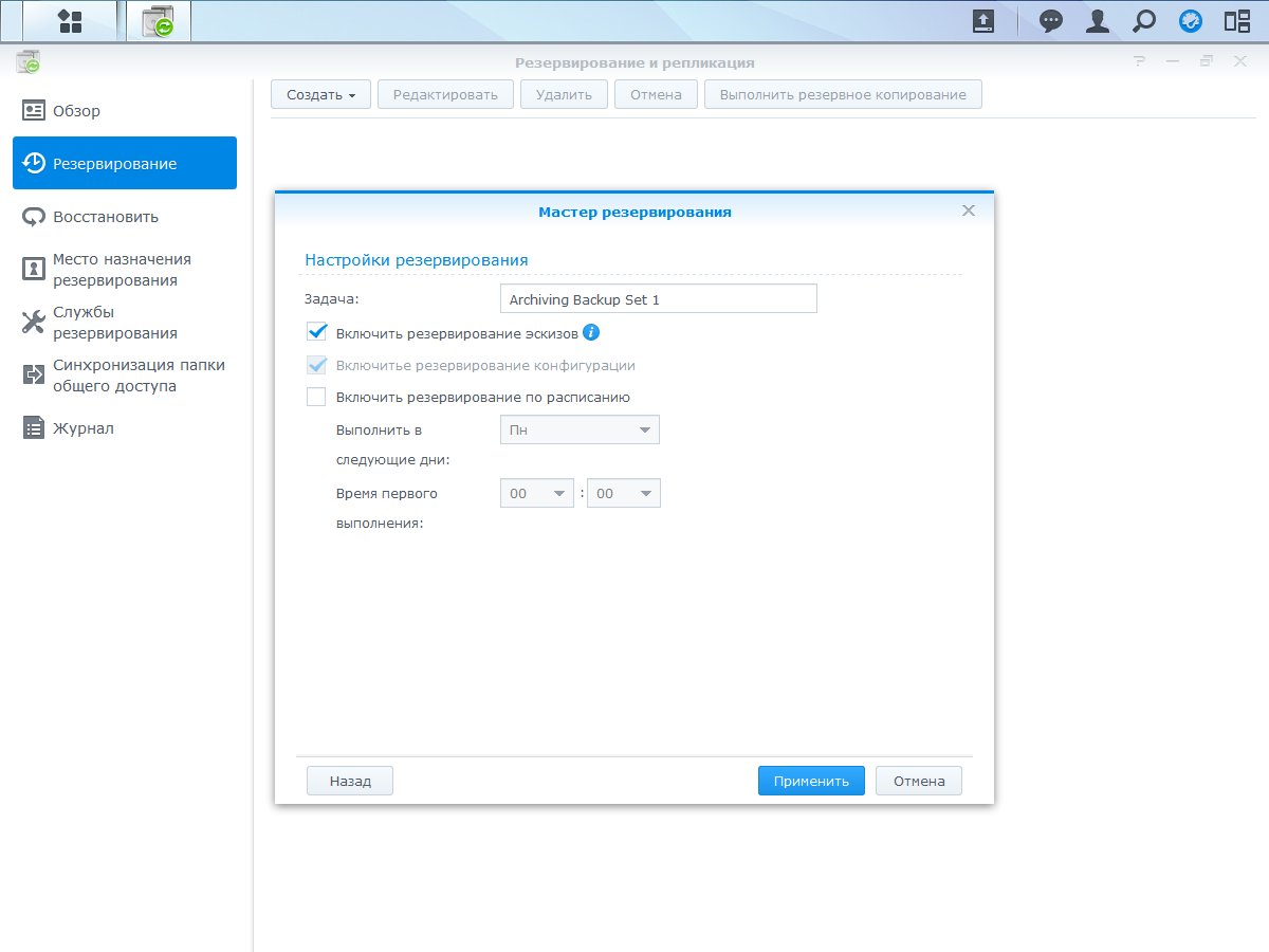 Дополнительно повысить надежность хранения данных поможет сервис резервного копирования. Он поддерживает работу с локальными накопителями, внешними устройствами, удаленными сетевыми системами и популярными облачными сервисами. Возможна работа с папками и файлами, iSCSI LUN, синхронизация данных по сети между устройствами Synology и, конечно, запуск заданий по расписанию.