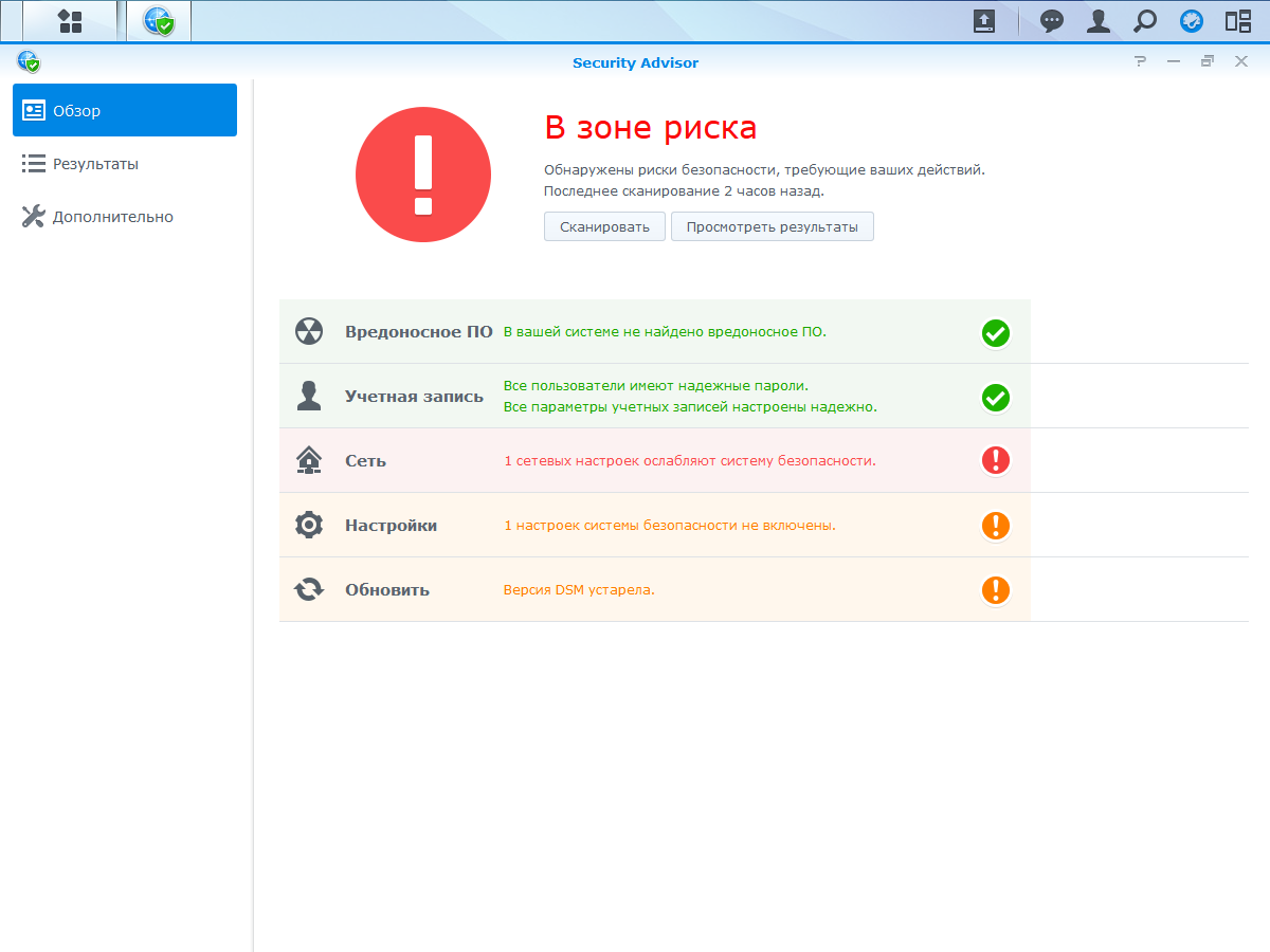 Сервис «Security Advisor» поможет вам держать под контролем все многочисленные настройки устройства и не допустить снижения уровня защиты. В частности, он проверяет сложность паролей, доступность и настройки сервисов, наличие обновлений прошивки и пакетов.