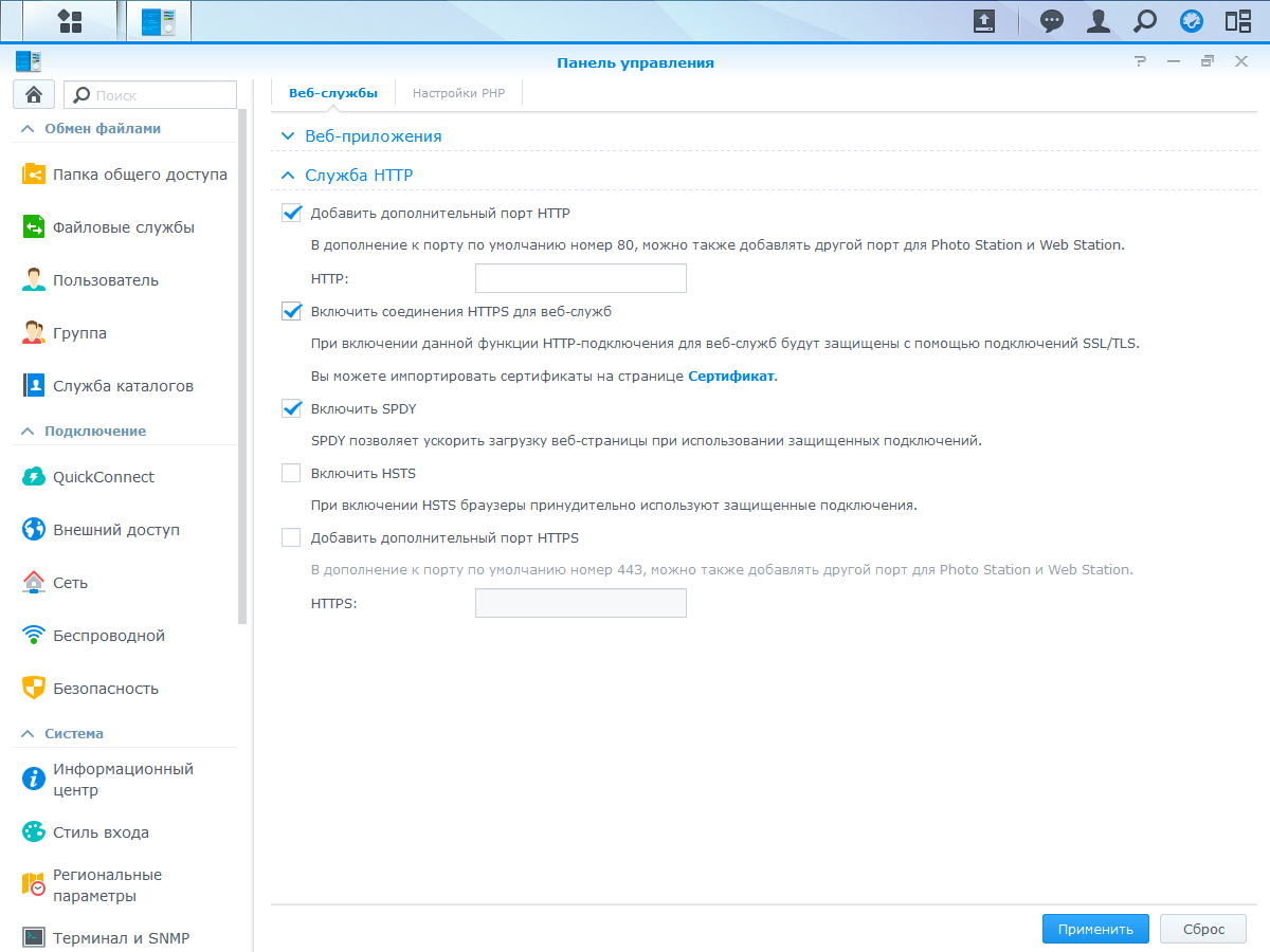 Один из немногих сервисов, который сохранился в основной прошивке — размещение веб-сайтов. Он поддерживает работу с виртуальными хостами, персональные сайты пользователей системы, протокол HTTPS и php.