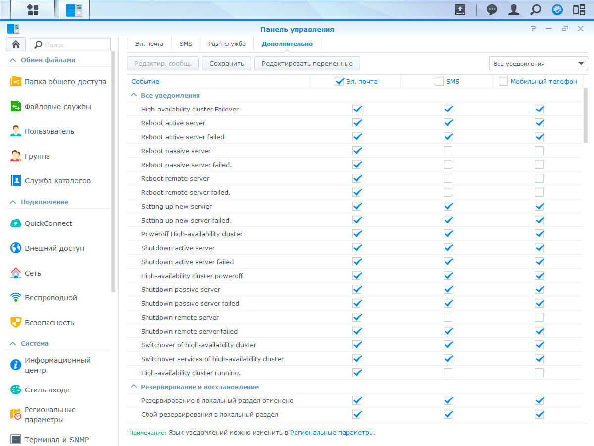 Для уведомления администратора о событиях сетевого накопителя, используются электронная почта, SMS (через внешний платный сервис) и Push-службы на мобильных устройствах. Предусмотрен гибкий выбор событий для каждого канала.