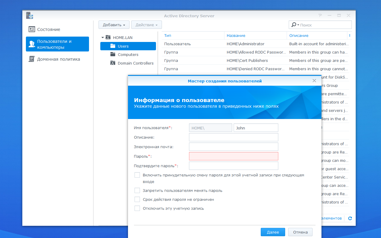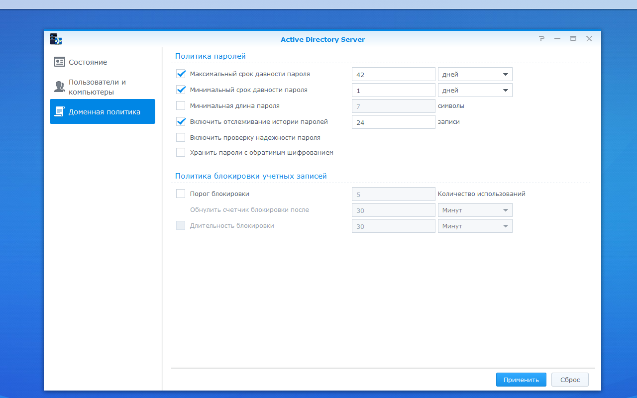 В составе пакетов новой версии DSM появился сервер Active Directory. Он позволяет вам использовать сетевой накопитель в роли контроллера домена, что может быть полезно для сегмента SMB, где покупка сервера с операционной системой Microsoft для небольших офисов может быть не оправдана.