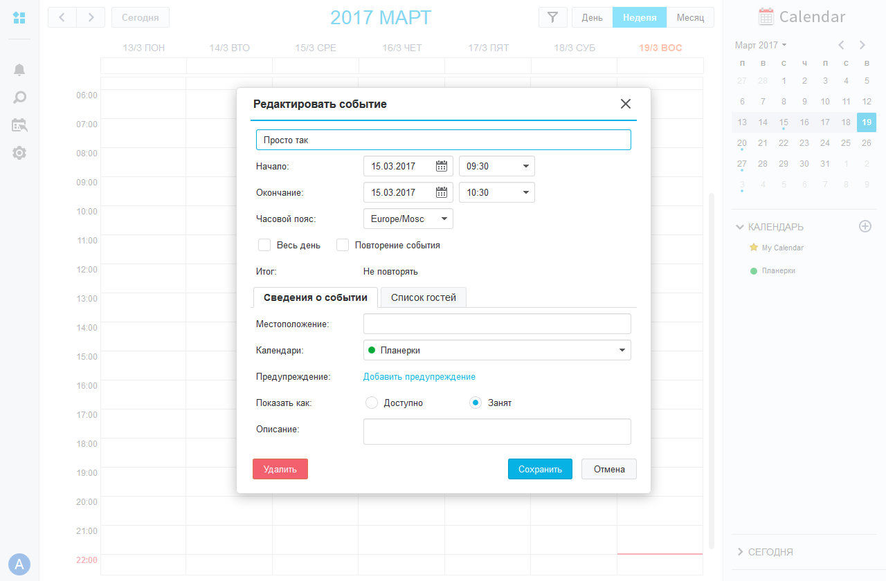 Кроме общих документов, одним из наиболее востребованных инструментов при совместной работе является календарь. Здесь все тоже выглядит достаточно интересно. Каждый пользователь может создавать собственные календари и предоставлять доступ к ним для других. Есть уведомления о событиях, поиск, статусы занятости, приглашения и подтверждения встреч, создание регулярных событий и мероприятий на весь день или несколько дней.