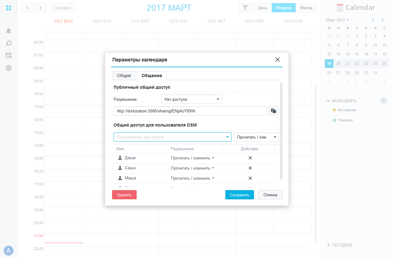 Благодаря поддержке протокола CalDAV, вы можете синхронизировать информацию календарей со своими мобильными устройствами и программами на компьютерах. Также здесь есть операции импорта и экспорта календарей.