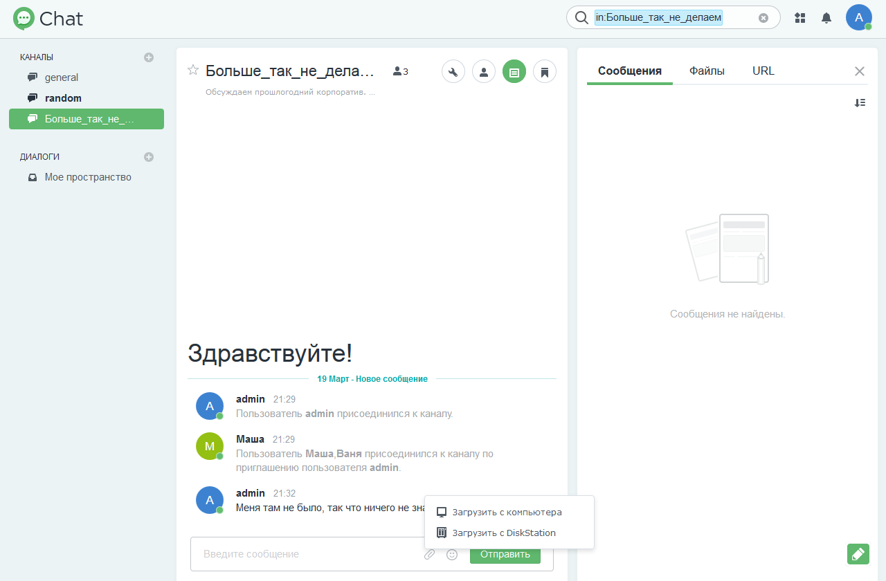 Но есть и традиционные форматы — частные переписки и общие каналы. В сообщениях можно использовать смайлики и хэштеги, вставлять файлы (как внешние, так и с сетевого накопителя), оформлять комментарии с цитированием, осуществлять поиск по нескольким критериям. Предусмотрен отдельный журнал всех действий в чате, а также резервное копирование и восстановление базы сообщений через модуль Hyper Backup. При этом сервис является открытым и позволяет реализовать интеграцию с другими системами через механизм Webhook. Отметим, что пользоваться чатом можно и на мобильных устройствах благодаря наличию фирменного приложения Synology Chat.