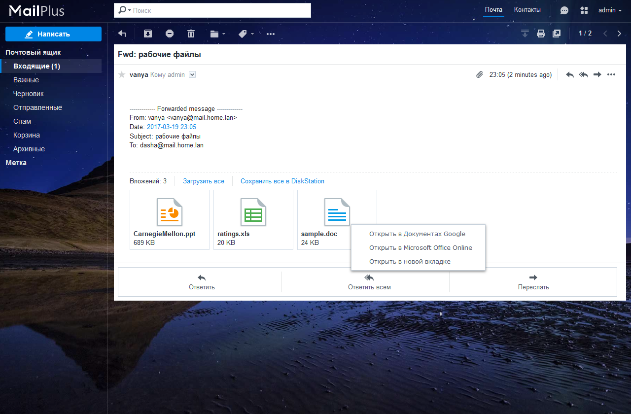 Почтовый сервер реализует стандартные способы работы, включая SMTP, POP3, IMAP4, в том числе и с шифрованием. Так что нет проблем с использованием традиционных почтовых клиентов на компьютерах и мобильных устройствах. Но есть и другие варианты — MailPlus клиент для браузера и одноименное мобильное приложение.