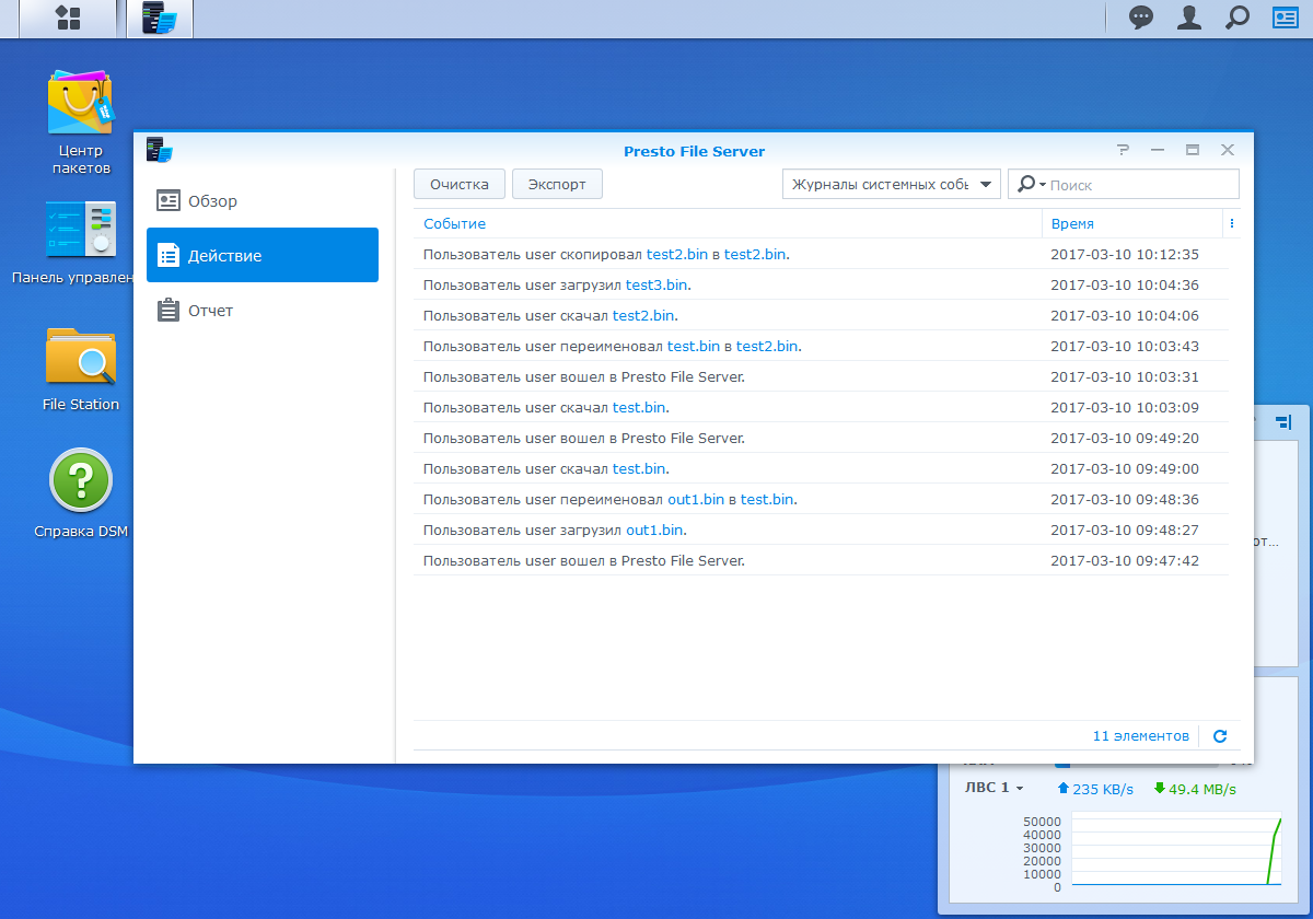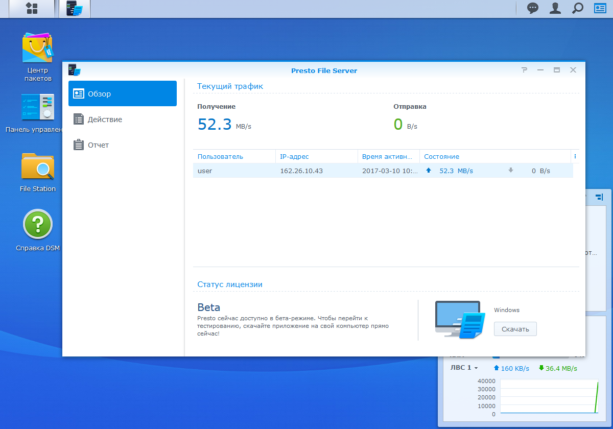 Несмотря на то, что в DSM реализовано множество протоколов сетевого доступа к данным, не всегда можно найти подходящий под ваши требования вариант. Это связано, в частности, с тем, что они могут не обеспечивать высокую эффективность и необходимые возможности контроля в современных условиях. Новый пакет Presto File Server призван решить эти задачи. Он обеспечивает высокую скорость работы как в локальной сети, так и через Интернет и имеет встроенные средства мониторинга. Кроме того, в нем заложены функции шифрования и сжатия трафика. Вполне логично, что реализовать все это невозможно без фирменного клиента. Он в настоящий момент представлен для трех наиболее распространенных на персональных компьютерах операционных систем.