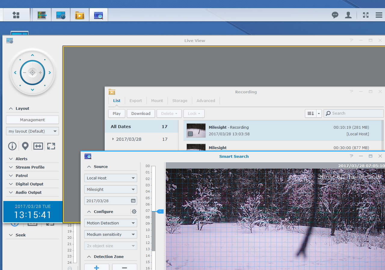 Кроме того, сервис как с автономным клиентом, так и доступе через браузер, обеспечивает работу современных моделей видеокамер с кодеками H.265, а также фирменных решений H.264+, Zipstream и Smart Stream от известных производителей камер, что позволяет снизить требования к пропускной способности и объему дискового пространства с сохранением качества видеозаписей. Отдельно стоит отметить поддержку устройств со встроенными функциями видеоанализа, реализованными в рамках программного интерфейса ACAP компании Axis. Это позволяет уменьшить нагрузку на процессор сетевого накопителя при реализации специальных функций контроля, включая обнаружение движения, слежения, виртуальных ограждений и других.