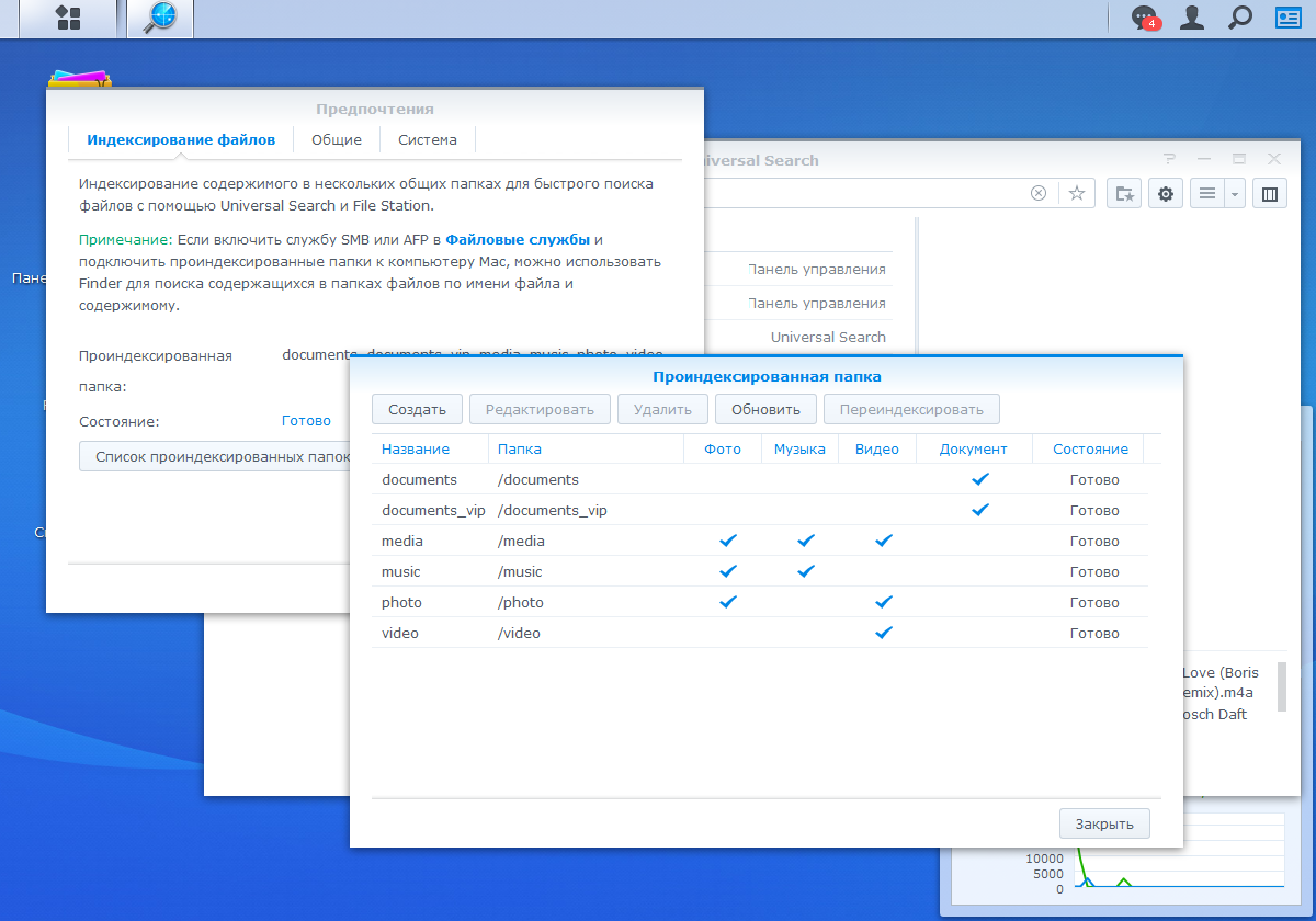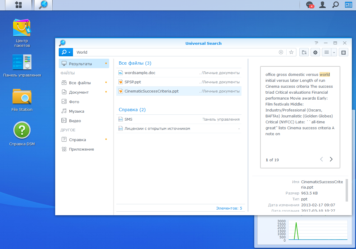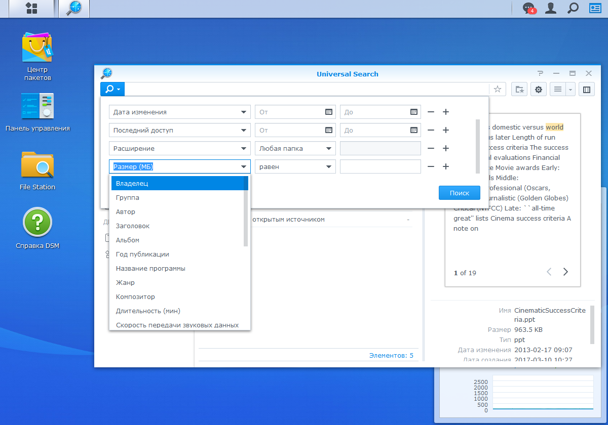 Учитывая объемы современных жестких дисков, вопрос поиска нужной информации на них стоит очень остро. Конечно, есть пользователи, которые способны держать свои файлы в оптимальном порядке, но большинство, все-таки, редко отличается аккуратностью. Еще более запущенная ситуация может встречаться в бизнес-сегменте, когда документы и их версии просто невозможно сосчитать. Как раз для таких случаев может быть использован пакет Synology Universal Search. Он позволяет осуществлять поиск по документам и мультимедийным файлам. Причем речь не только об их именах, но и о содержимом.