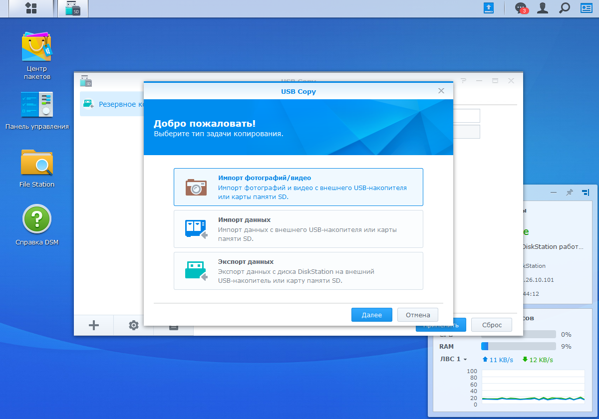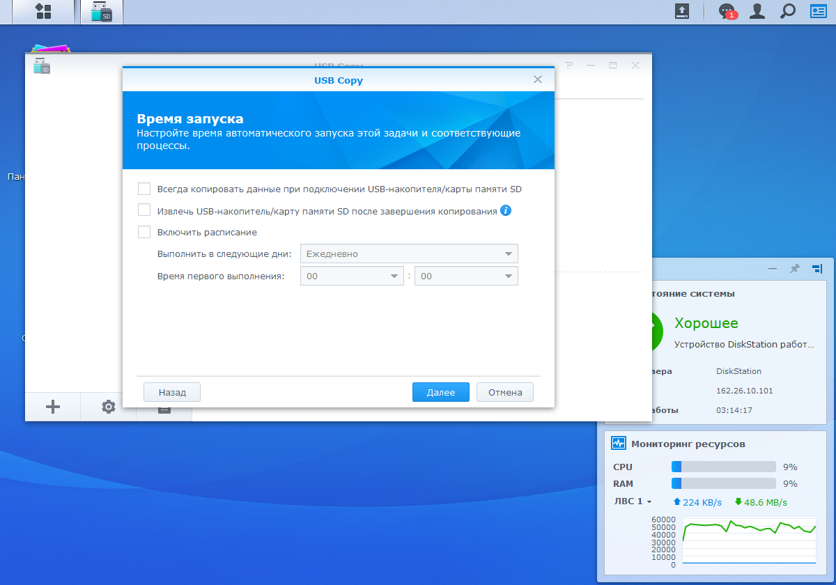 Модуль USB Copy позволяет вам создавать задания одного из трех типов: импорт фотографий и видео с внешнего носителя, импорт файлов с внешнего носителя, экспорт файлов на внешний носитель. Для каждой задачи можно выбрать режим (несколько версий, зеркалирование или инкрементный), настроить расписание или автоматический запуск при подключении конкретного внешнего диска, включить ротацию копий, отключение внешнего диска после операции, расписание работы, фильтры файлов по типам.