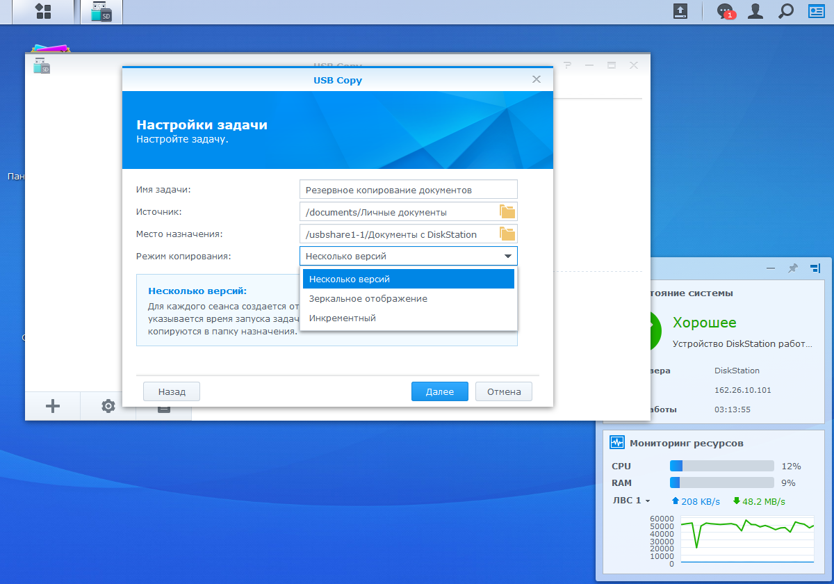 Что интересно, сервис позволяет использовать не только обычное копирование, но хранение нескольких версий, режим зеркалирования и дифференциальный режим. Правда возможности, по сравнению с Hyper Backup, существенно скромнее. В частности, хранение версий реализуется через создание новой папки в месте назначения при каждом запуске. Зато не будет никаких сложностей с доступом к копиям, что можно реализовать и для пользователей прямо по сети без применения дополнительного программного обеспечения или браузера.