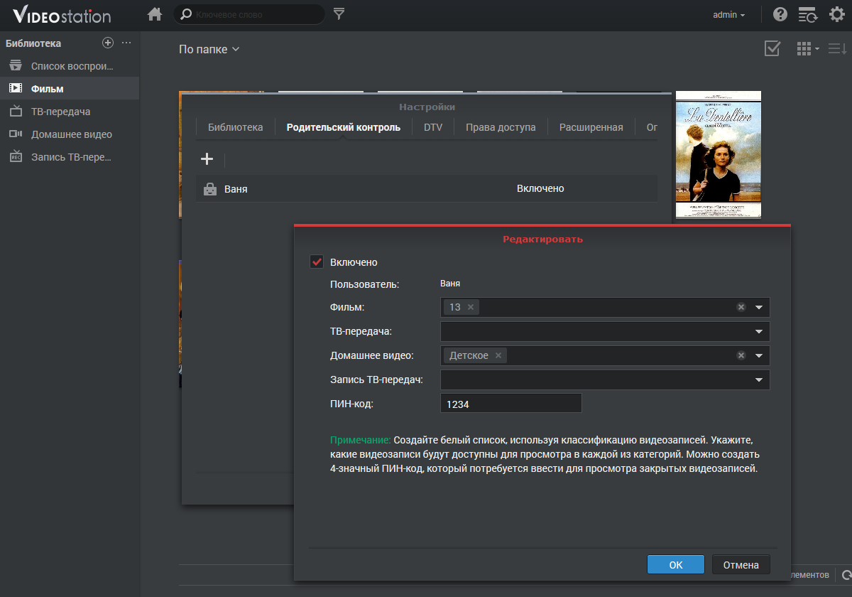 Далее на странице «Родительский контроль» вы настраиваете для требуемых аккаунтов разрешенные категории контента. Дополнительно можно указать PIN-код, который даст доступ ко всем остальным записям. Заметим, что в каталоге пользователь будет видеть и «закрытое» видео, запрос кода доступа будет производиться при попытке открытия таких файлов.