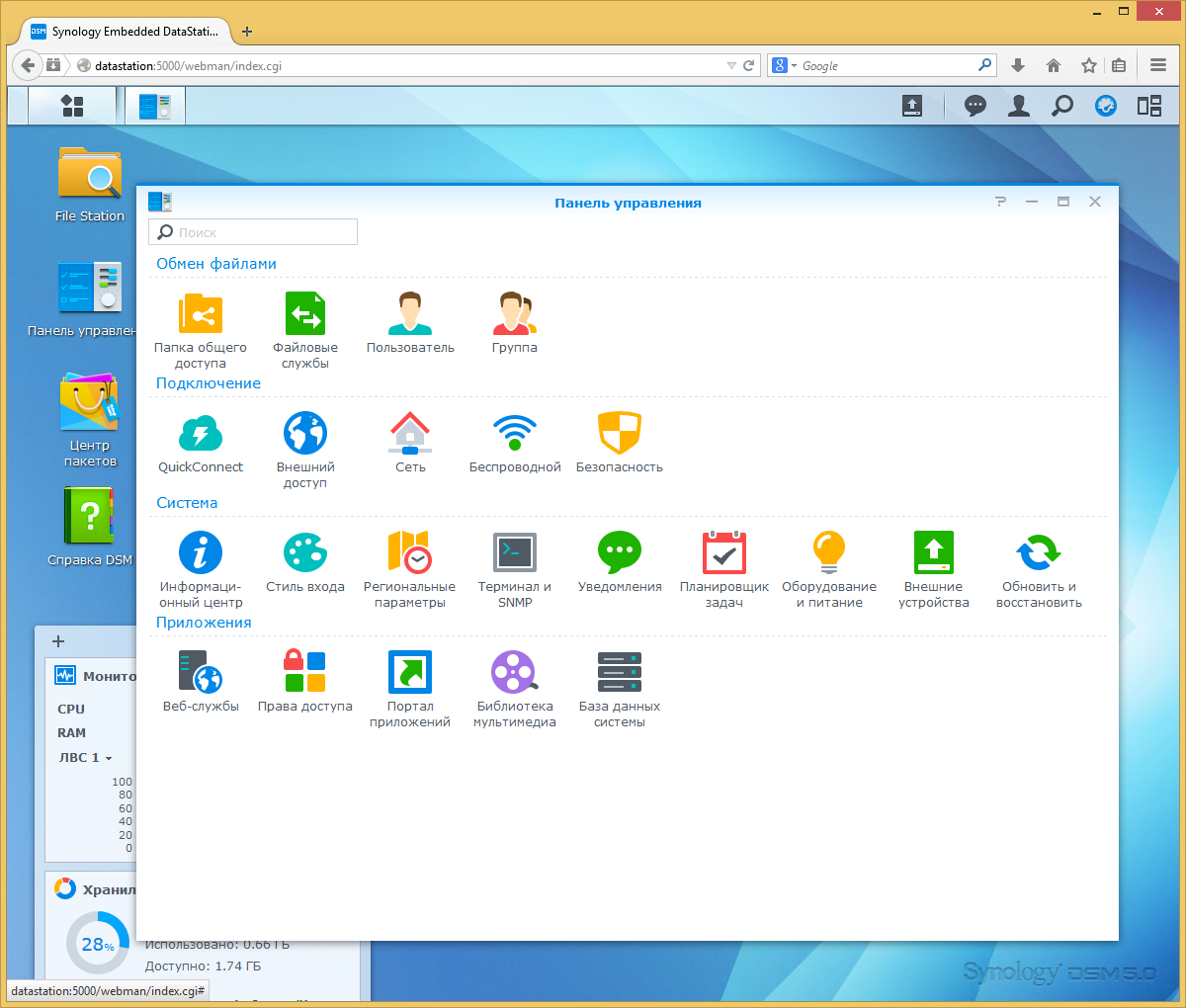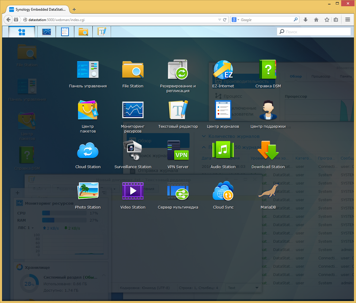 По внешнему виду он не отличается от других современных моделей Synology, но набор функции может отличаться. Так что в описании мы будем сравнивать EDS14 с «полноценными» решениями. В оформлении используются современные Web-технологии, так что результат очень похож на рабочий стол современной графической операционной системы. Поддерживается многооконный режим, есть выделенные элементы для уведомлений, поиска, справки и других часто используемых функций. Отметим наличие качественного перевода на несколько языков, включая русский.