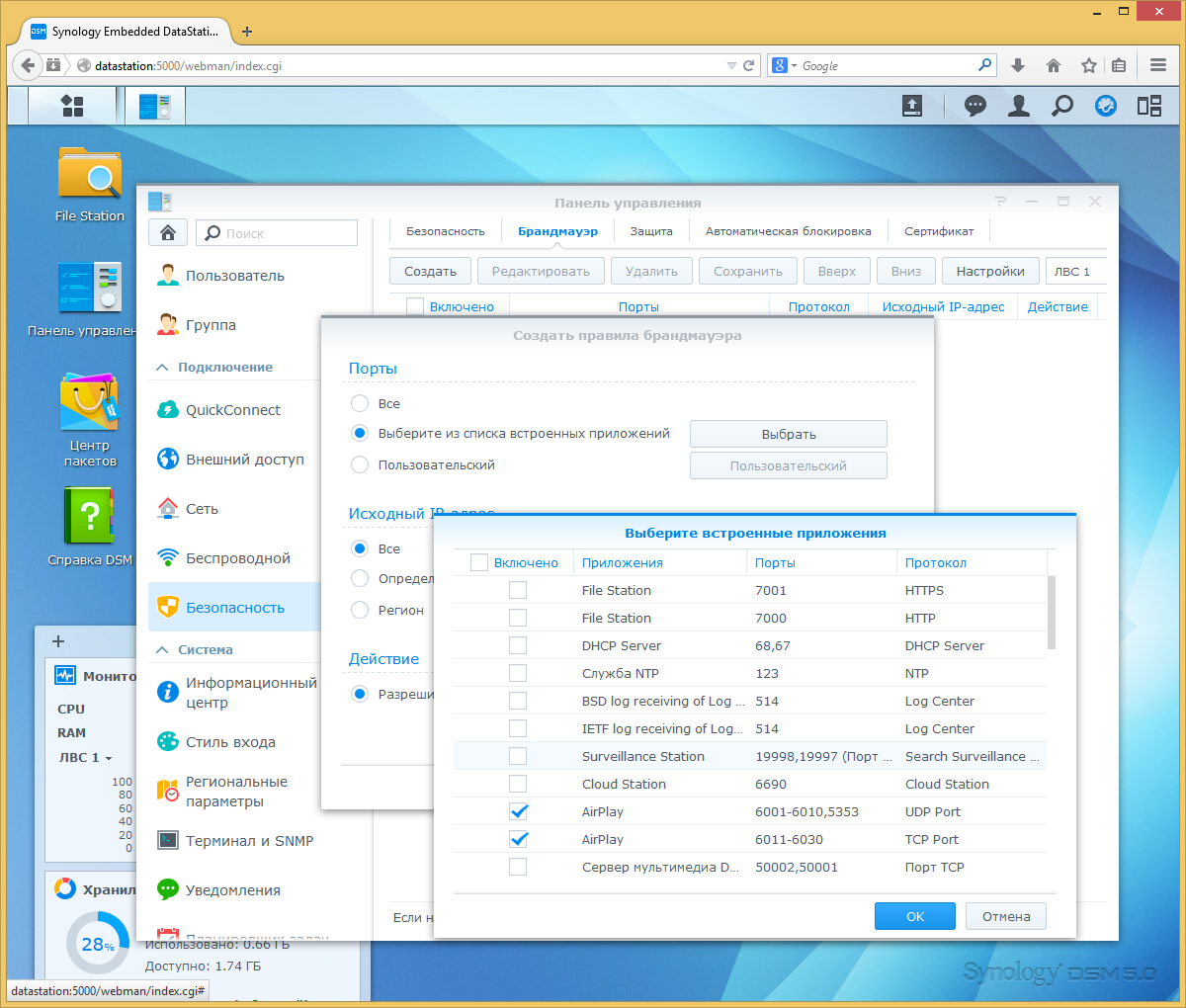 Впрочем, основные интересные и полезные программы присутствуют, включая большинство фирменных сервисов Synology: Audio Station, Cloud Station, Cloud Sync, Download Station, iTunes Server, Photo Station, Surveillance Station (поддерживается до пяти камер), Video Station, VPN Server, Сервер мультимедиа. Так что с данной моделью можно реализовать, например, сценарии видеорегистратора на транспорте, медиасервера в личном автомобиле или мобильного офисного сервера в минивэне. Среди пакетов сторонних разработчиков стоит упомянуть поддержку Drupal, Joomla, Logitech Media Server, MariaDB, Perl, phpMyAdmin, Phyton и WordPress. Что касается самых существенных «потерь», то в их число попали антивирусы, Asterisk, Cloud Station Client, Mail Server/Mail Station и Time Backup.