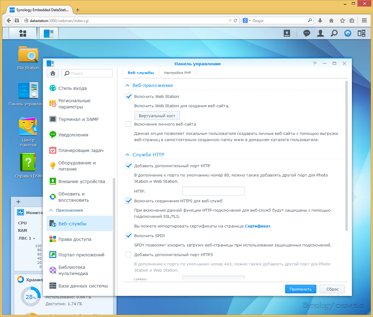 В базовой прошивке предусмотрена реализация Web Station — сервиса хостинга Web-сайтов. Напомним, что он поддерживает работу с виртуальными и личными сайтами, php и HTTPS, позволяет изменить номера портов и загрузить собственные сертификаты.