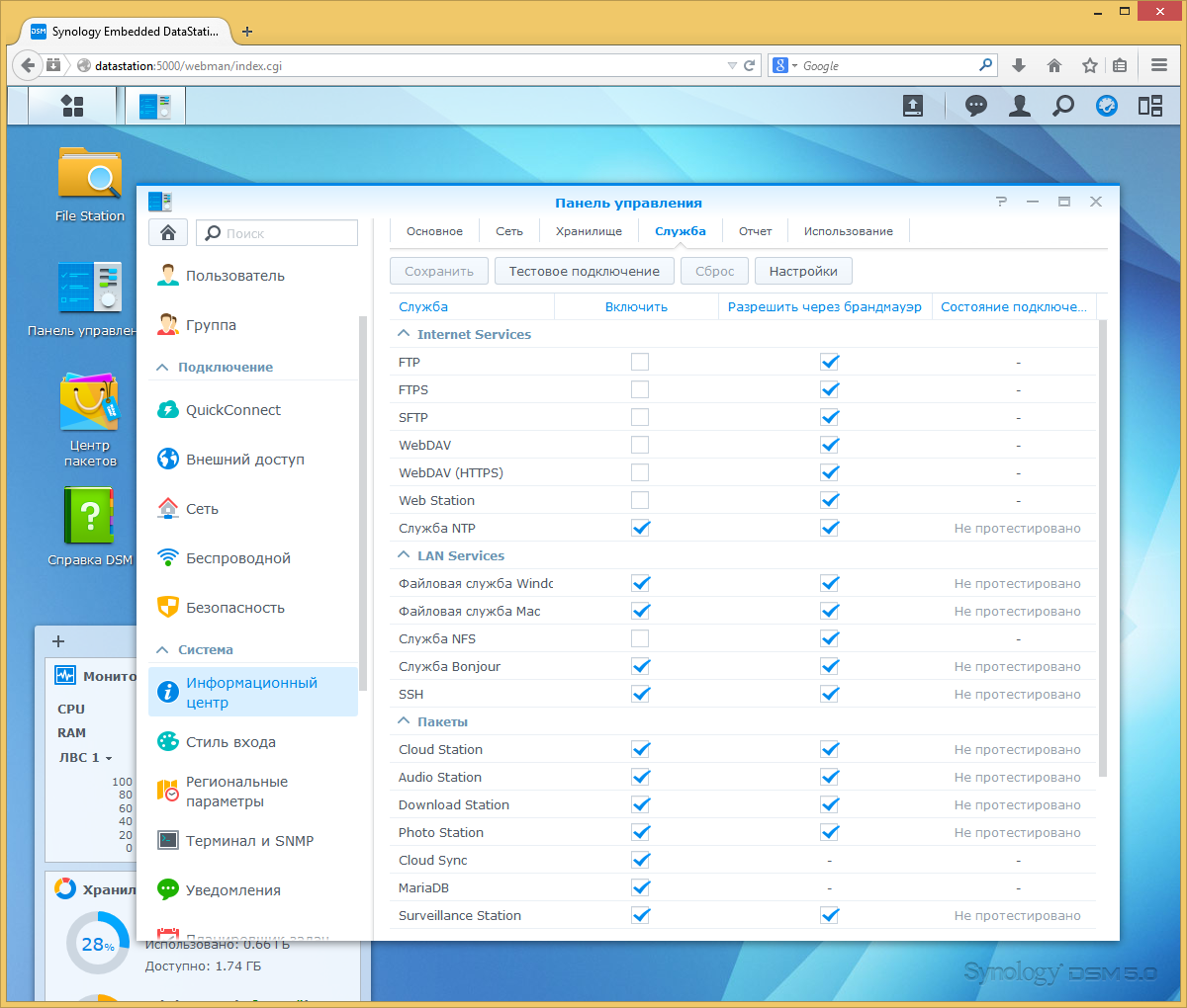 Тестирование устройства проводилось с прошивкой DSM версии 5.0-4622, выпущенной специально для EDS14.