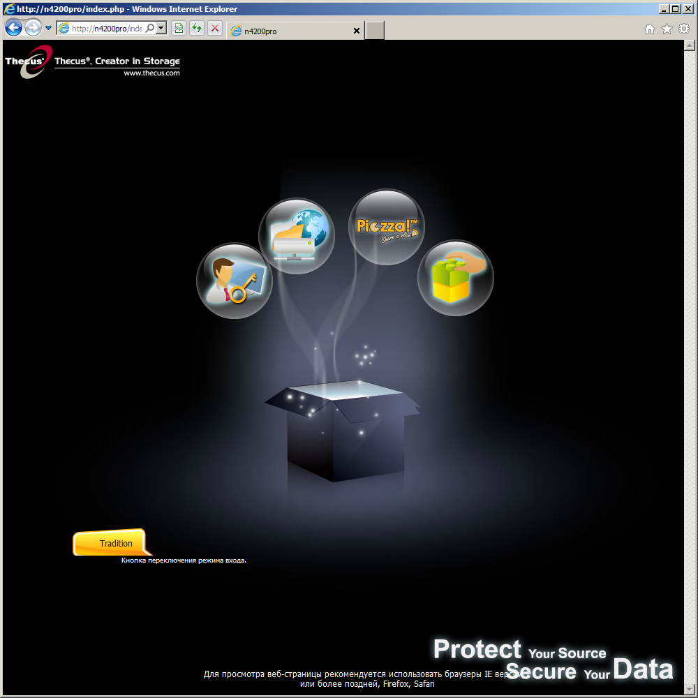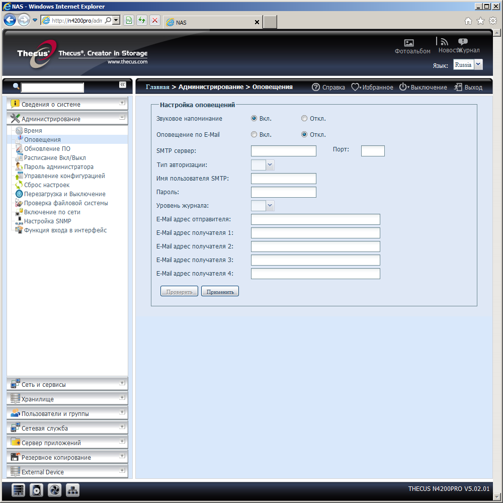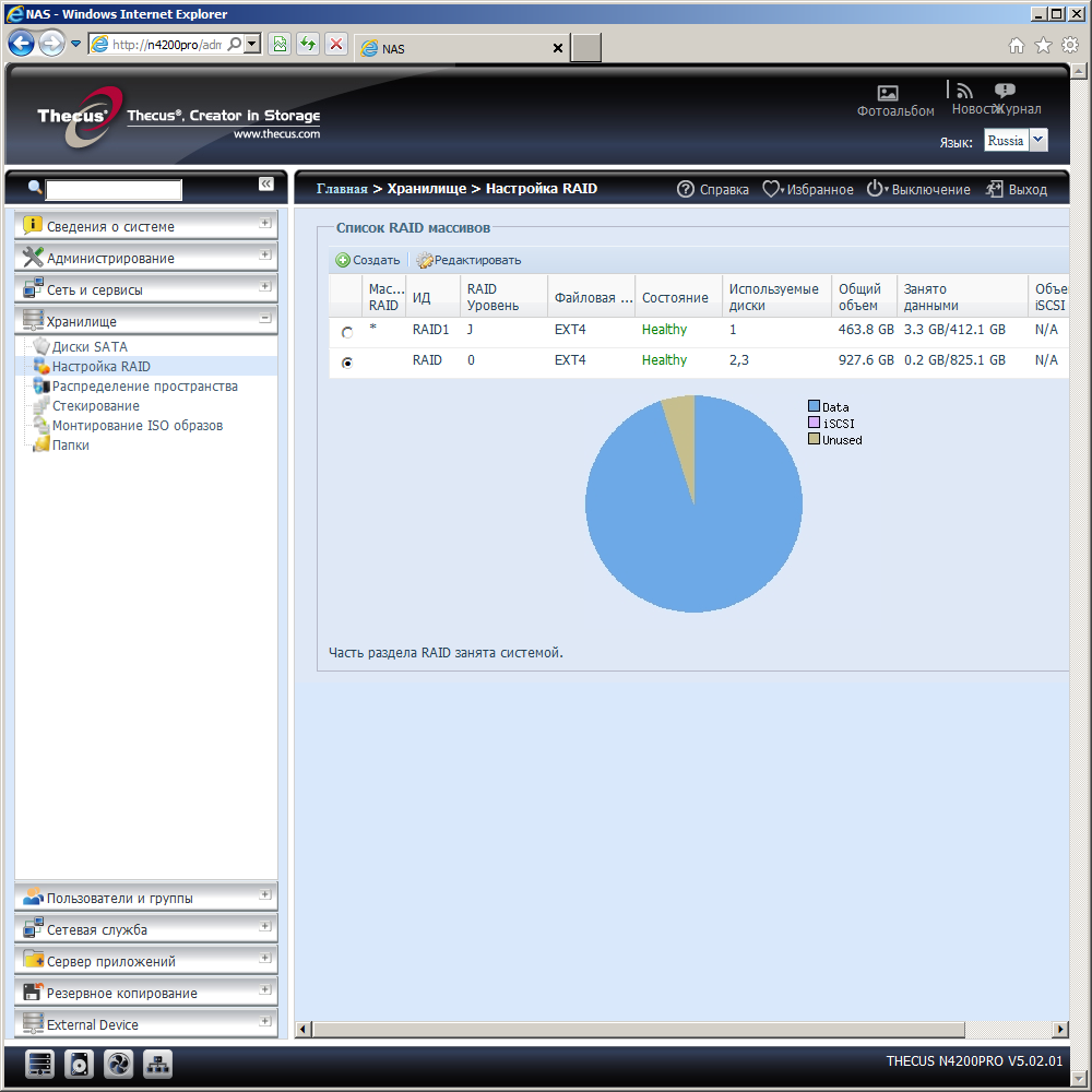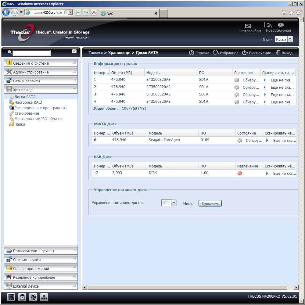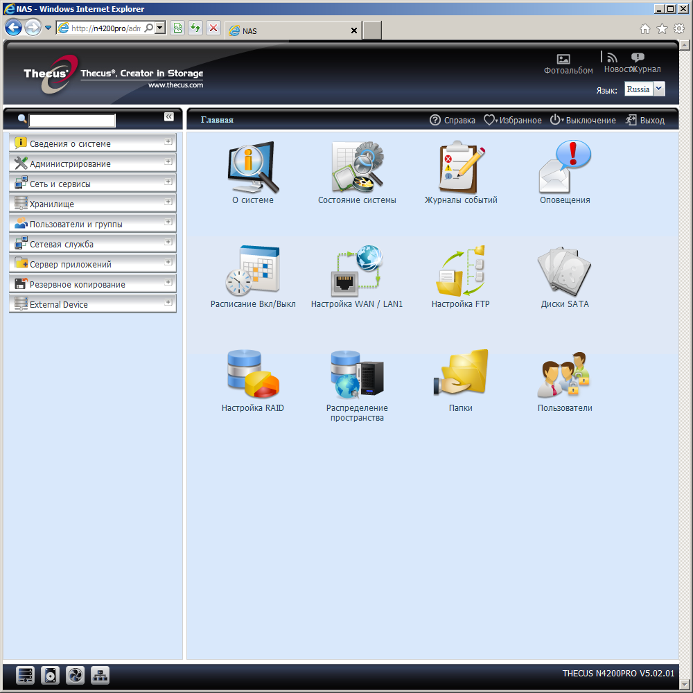 Накопитель поставляется без винчестеров, так что первым действием перед запуском будет их установка. Конструкция салазок позволяет использовать 3,5″ или 2,5″ диски. После этого нужно подключить сетевой кабель в порт WAN/LAN1, блок питания и включить устройство. Основная часть прошивки накопителя размещается на флеш-диске, так что этапа по установке ее с ПК на раздел винчестера можно обойтись. Для первоначальной настройки сетевых адресов и пароля администратора можно использовать утилиту Thecus Setup Wizard. Все остальные параметры, включая конфигурацию дисковых массивов нужно делать через Web-интерфейс. Он умеет работать через шифрованное соединение https и поддерживает несколько языков, включая русский. Переключение локализации доступно после первого входа и относится не только к Web-интерфейсу, но и сообщениям на дисплее самого накопителя.