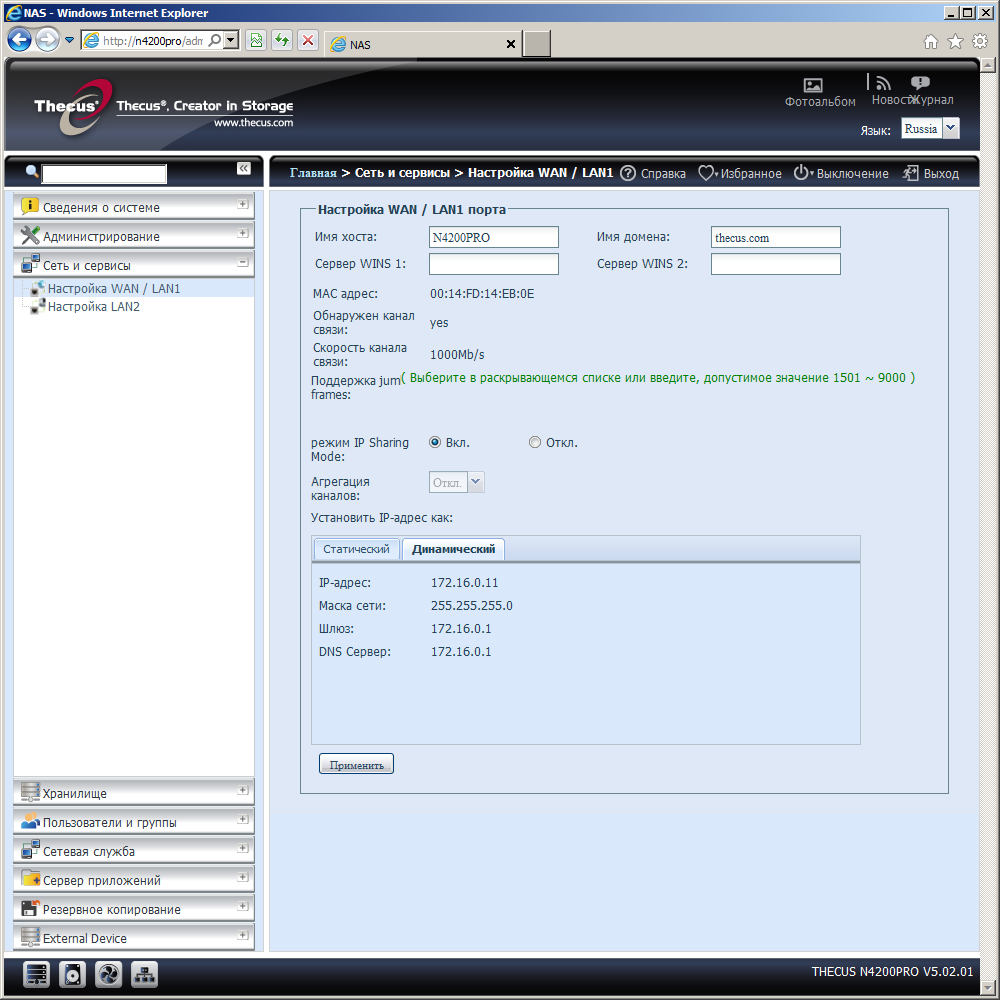 Накопитель имеет два гигабитных сетевых порта. Адреса им можно назначить на сервере DHCP или же указать вручную. Они могут работать независимо друг от друга или быть объединены для увеличения скорости и надежности. В первом случае сетевой накопитель может также работать в качестве роутера для сегмента сети, подключенного ко второму порту. Для этого на нем включается сервер DHCP, а на первом порту — режим «IP Sharing». Оба интерфейса поддерживают Jumbo Frames, но в нашем тестировании мы снова столкнулись с тем, что при установке максимального размера пакета в 9000 байт, устройство работает нестабильно. Поэтому тесты производительности проводились с отключенной технологией. Жаль, что за полтора года, которые прошли со времени прошлого тестирования, проблема не была решена. В некоторых сценариях работы может оказаться полезной функция включения устройства по сети (WOL).