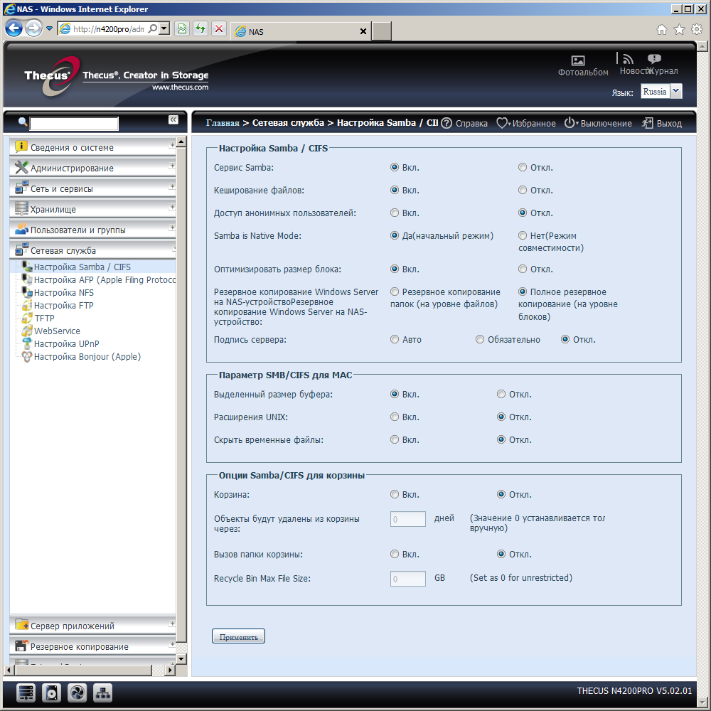 Накопитель позволяет организовать сетевой доступ к файлам по протоколам SMB/CIFS, AFP, NFS, FTP, TFTP, HTTP(S). У первого из них есть множество настраиваемых опций, наиболее интересная из которых — сетевая корзина для удаленных файлов. Причем возможно указать максимальное время хранения и ограничить ее объем. Прямая поддержка AFP позволит эффективно работать с устройством и пользователям Mac OS. Отметим совместимость с версией 10.7 этой операционной системы и программой Time Machine. Работа с NFS (включая четвертую версию протокола) будет интересна пользователям Linux. Никаких специальных настроек у этого протокола нет.