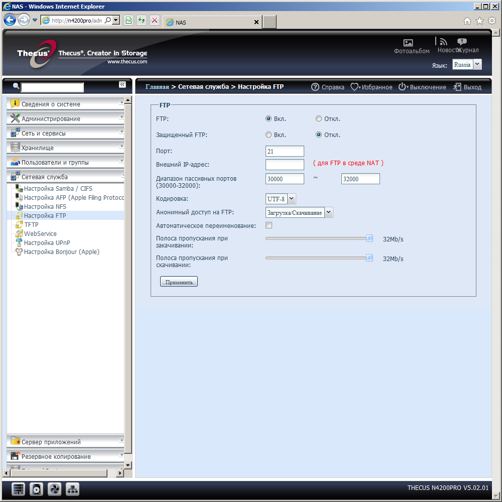 Сервер FTP поддерживает пассивный режим, кодировку Unicode и шифрование протокола (Explicit). Предусмотрена возможность изменения номеров портов и ограничения скоростей загрузки и скачивания. Возможные значения этих параметров — от 1 до 32 МБ/с. Хотя само устройство способно отдавать данные и на гораздо более высоких скоростях.