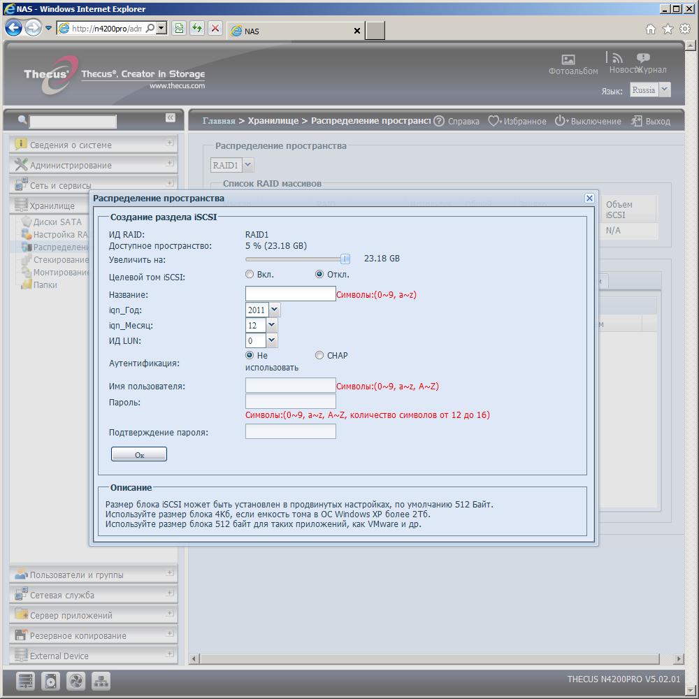 Накопитель поддерживает организацию томов iSCSI на уже существующих массивах. Именно для них резервируется место (по умолчанию — 5% объема) в момент создания последних. В документации указано, что всего для N4200Pro можно запрограммировать до пяти томов iSCSI. Тома данного типа могут иметь проверку контрольных сумм и аутентификацию CHAP, поддерживают расширение объема и thin-provisioning.