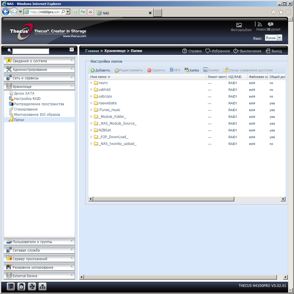 Перед созданием общих ресурсов необходимо определиться с дисковыми массивами. В накопителе можно создать несколько томов, поддерживаются режимы JBOD, RAID0/1/10/5/6, выделение диска автоматической замены для отказоустойчивых массивов. Интересной особенностью устройств от Thecus является возможность выбора файловой системы для тома из набора EXT3, EXT4, XFS, ZFS и размера блока массива. Отметим, что разные файловые системы могут иметь как преимущества, так и недостатки. Так что рекомендуется внимательно ознакомиться с документацией перед созданием массивов.