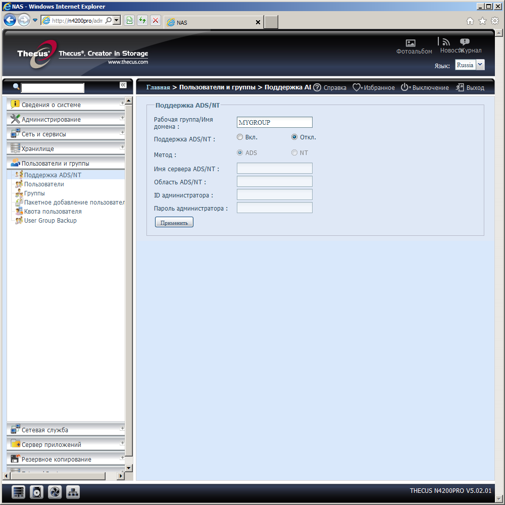 Как и положено бизнес-модели, N4200Pro может быть интегрирован в домен Windows для единого управления пользователями и группами. Если же ваша компания не использует эту технологию, то придется программировать пользователей прямо на устройстве. Для упрощения процесса в случае большого числа клиентов, можно использовать опцию по импорту списка пользователей, паролей и групп из обычного текстового файла. Возможен также импорт и экспорт списка пользователей и групп в закрытом формате. Данное устройство может ограничивать доступный пользователям объем с использованием дисковых квот (одинаковый лимит для каждого тома).