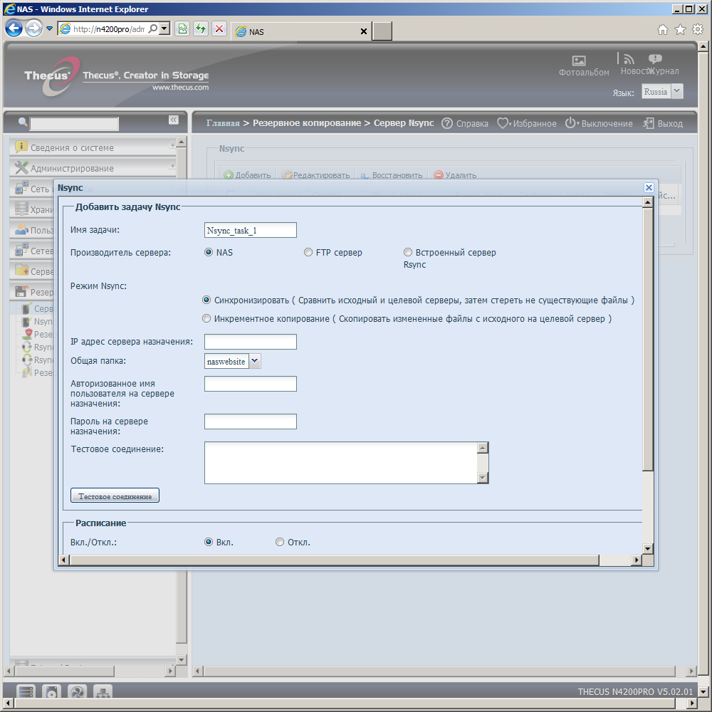 N4200Pro поддерживает работу в режиме сервера Nsync — фирменной реализации протокола синхронизации от Thecus, а также стандартного сервера Rsync. В накопителе предусмотрено создание нескольких заданий резервного копирования на сервер Nsync, Rsync или FTP. Пользователь может выбрать общие директории для копирования, режим (синхронизация или добавление) и расписание (ежедневный, еженедельный или ежемесячный запуск в указанный день и время). При работе с Rsync можно записывать протокол исполнения задания в нужную директорию.