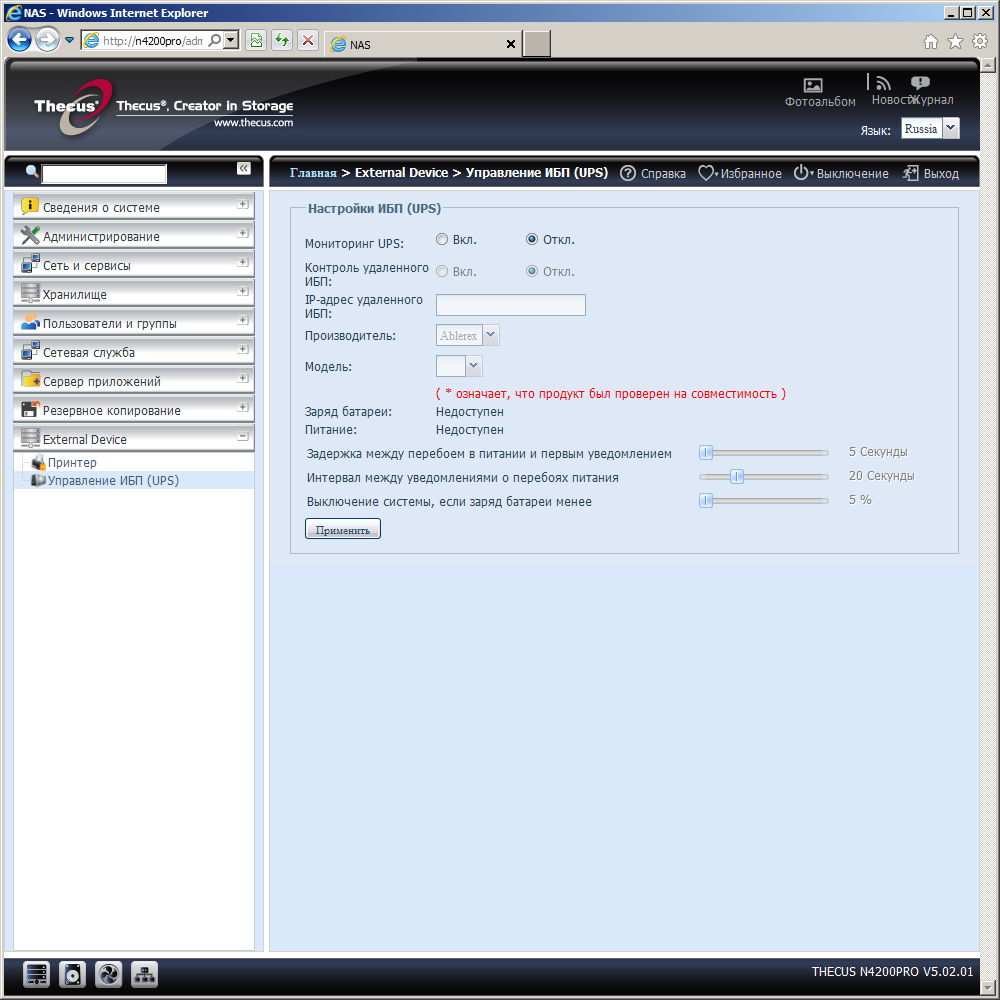 С источниками бесперебойного питания ситуация хорошая — почти два десятка производителей в списке совместимости, чему могут позавидовать многие другие компании. В последней версии прошивки появилась возможность сетевой работы с ИБП, что позволит использовать одно устройство для нескольких сетевых накопителей сразу. Настройки сервиса включают в себя указание модели и установку интервала отправки сообщений о сбое и выбора уровня зарядки батареи, при котором накопитель самостоятельно безопасно отключится.