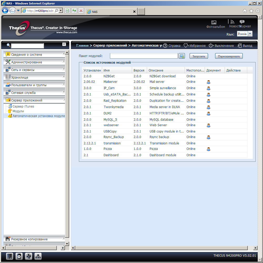 Модули могут иметь собственные страницы с настройками и быть представленными на главном экране входа в устройство. Стоит обратить внимание и на возможную зависимость одних программ от других. К счастью, эта информация предоставлена в описании. Не очень удобно то, что скачивать модули нужно на одной странице, а запускать и настраивать — на другой. Еще одной неприятностью является хранение модулей на разделе с данными — выбранном «главном» массиве. В случае удаления этого дискового массива, все модули и их настройки теряются.