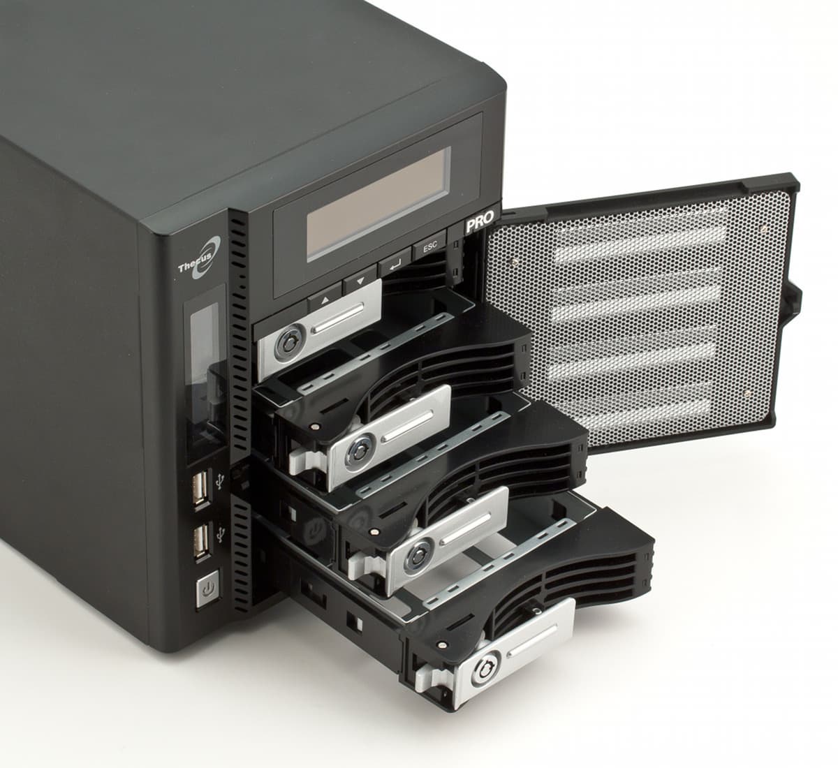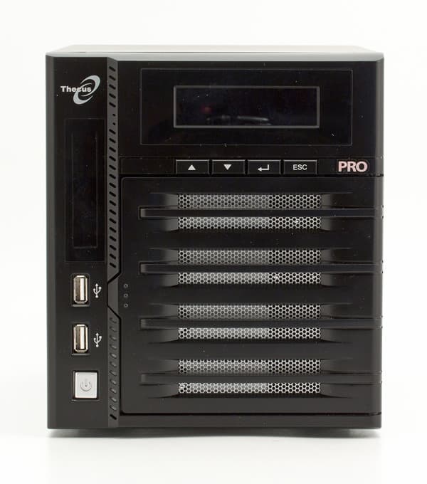Отметим, что индикаторы имеют соответствующие логотипы и по их свечению достаточно просто определить состояние устройства. Матричный дисплей имеет дополнение в виде четырех кнопок и может использоваться для просмотра системной информации (сетевых адресов, состояния дисковых массивов), запуска некоторых функций и даже настроек накопителя (доступны после ввода пароля). На передней панели можно также найти два порта USB (у большинства других устройств здесь есть только один) и кнопку включения устройства. Отсек для установки винчестеров закрыт дверцей, в которой есть металлическая решетка, что помогает системе вентиляции.