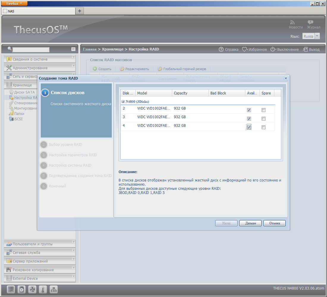 N4800 умеет работать с дисковыми массивами различных типов — JBOD, RAID0/1/5/6/10. Для отказоустойчивых версий можно заранее указать диски горячей замены, которые будут использованы в случае отказа основных.
