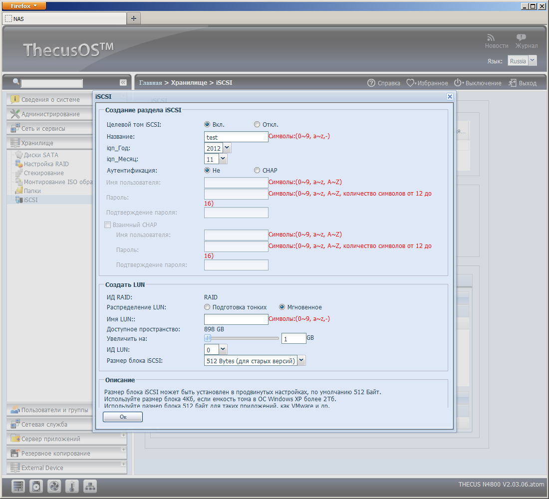 Тома для работы с протоколом iSCSI создаются в файловом режиме на существующих разделах. Устройство поддерживает такие опции, как CHAP, Mutual CHAP, Thin-Provision, iSCSI CRC, iSCSI block size, LUN ACL, LUN Expand и другие.