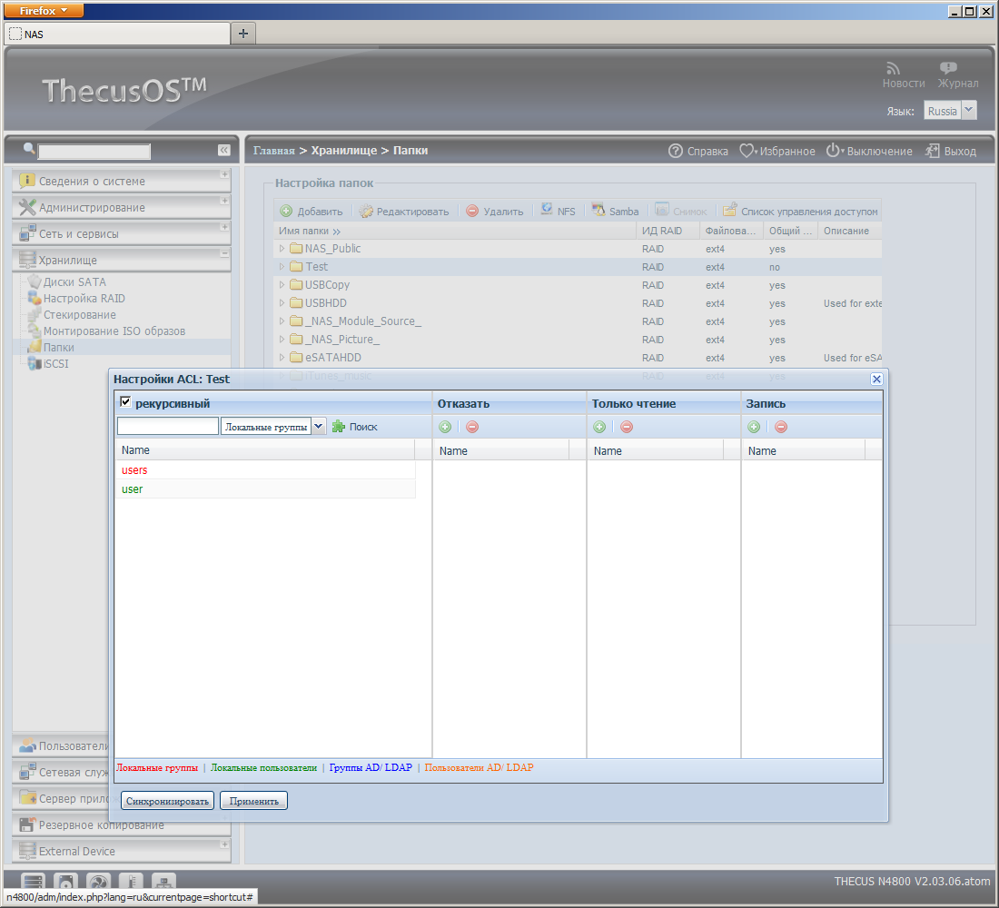 Накопитель позволяет использовать списки контроля доступа для файлов и директорий на общих ресурсах (кроме внешних накопителей). Дополнительно есть возможность сохранения и восстановления этих данных.