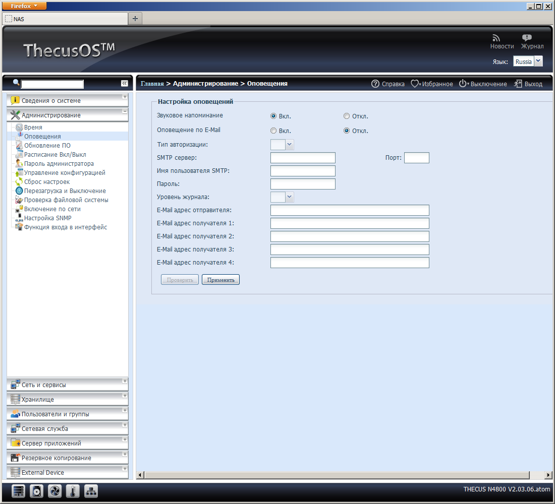 Сервис уведомлений работает через стандартные технологии электронной почты. В опциях можно указать параметры сервера SMTP и до четырех адресов получателей. Если же администратор находится недалеко от накопителя, то он сможет определить критическую ситуацию по звуковому сигналу, светодиодам и дисплею на передней панели. Возможно и использование сервиса Syslog. Накопитель может работать как клиентом, так и сервером. Во втором случае логи просто сохраняются в файлах на указанном общем ресурсе. Никаких средств для их просмотра через web-интерфейс не предусмотрено.