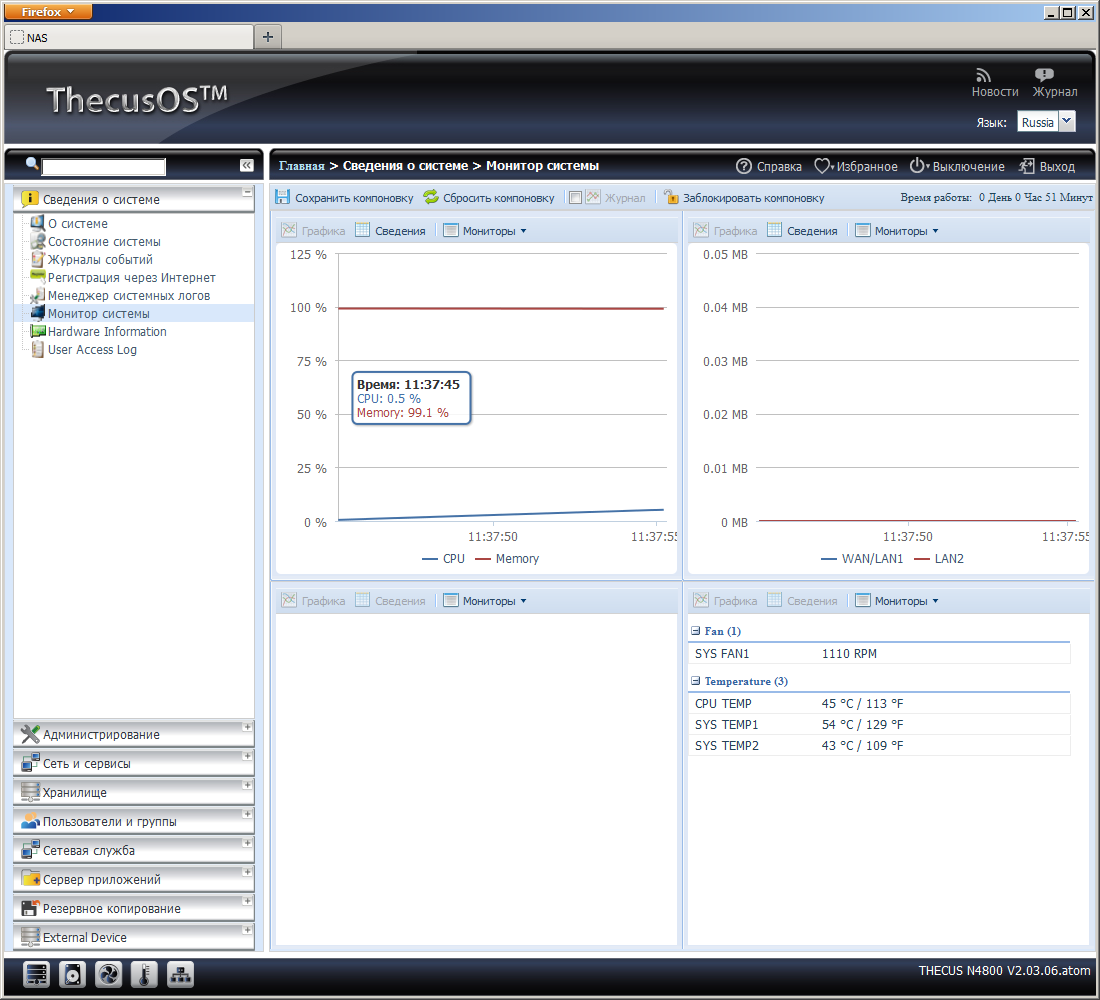 Также были существенно расширены возможности проверки текущего состояния накопителя. Теперь, кроме статуса сервисов, можно увидеть информацию о загрузке процессора, оперативной памяти и сетевых интерфейсов, температуры и скорость вращения вентилятора, детали аппаратной конфигурации устройства. Причем некоторые из этих данных представлены также в динамике в виде графиков.