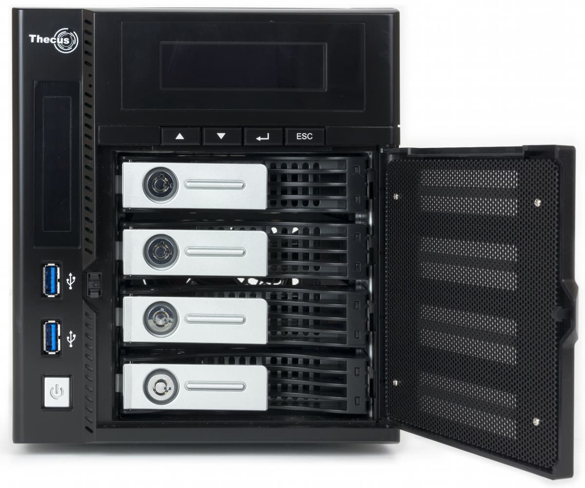 Thecus N4800 интересен, прежде всего, своей аппаратной конфигурацией: четырехпоточный x86-процессор с частотой более 2 ГГц, 2 ГБ оперативной памяти, порты USB 3.0 и eSATA, два сетевых интерфейса, слоты PCIe и miniPCIe, видеовыходы VGA и HDMI, встроенный аккумулятор, матричный дисплей. Подобная начинка позволяет ему получить высокие показатели в тестах производительности — 110 МБ/с на чтении и 80 МБ/с на записи. Причем скорость мало зависит от типа дискового массива.