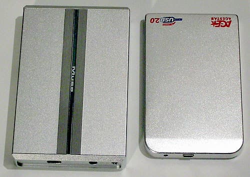 Пару слов о размерах инкложи TT A2291. Полгода назад я воодушевленно расписывал прелести миниатюрнейшего (насколько возможно) и при этом дешевого контейнера для таких же винчестеров AgeStar IUB2O1. К хорошему, как водится, привыкаешь быстро, поэтому появление новых продуктов, уступающих хоть в чем-то прежним полюбившимся, нередко воспринимается в штыки. Двухдюймовая инкложа серии Muse хоть и смотрится эдаким стилягой, габариты имеет отнюдь не самые малые в данном классе устройств: 130×82×20 куб. мм против, например, 118×72×11 для AgeStar IUB2O1, да и вес больше — 155 граммов без диска! Впрочем, лучше один раз увидеть, чем сто раз прочесть, поэтому просто сравним их на фото — сбоку