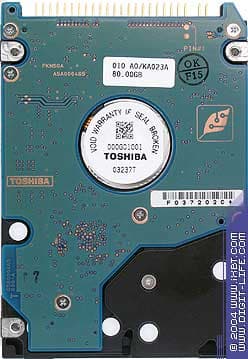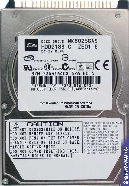 Пресс-релиз с датой анонса диска, казалось бы, за давностью лет потерялся в архивах официального сайта. Однако после непродолжительного серфинга можно наткнуться на документ, в котором черным по монитору указывается время разработки — январь 2003. в котором указывается время разработки — январь 2003. Косвенным подтверждением служат и две последние цифры в номере модели, указывающие на относительное время выпуска — как раз между семействами MKxx21GAS и MKxx25GAS. Также следует отметить, что это единственный диск в серии MKxx23GAS. Самая низкая плотность записи среди тестируемых сегодня дисков на первый взгляд не позволяют MK2023GAS составить достойную конкуренцию, но часто внешность бывает обманчива. Как и во всех тестируемых сегодня дисках, в этом используется Fluid Dynamic Bearing (FDB) мотор, дальше на этом останавливаться не буду. Кстати, если доверять информации о времени выхода жестких дисков, то краткие обзоры пугают, получается, что для инженеров Toshib'ы плотность записи, равная 39.1 Gbits/sq.inch превосходит 48.8 Gbits/sq.inch... Это было написано ещё зимой, и тогда чего ждать во время сезонного весеннего обострения?!