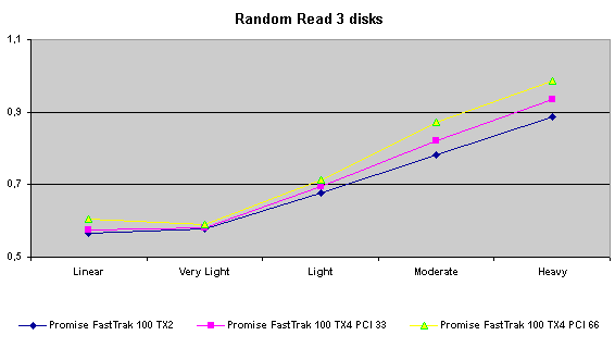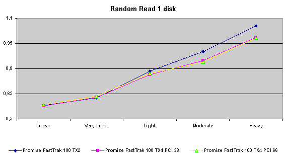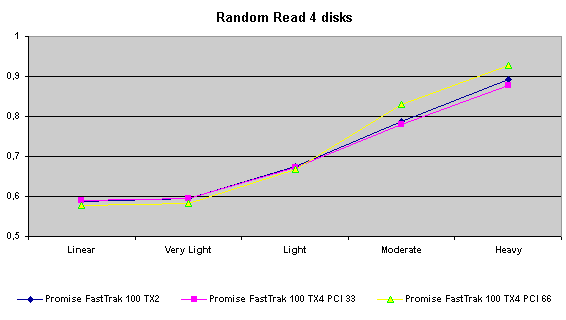 В последовательных моделях при чтении четко прослеживается преимущество 66-мегагерцовой шины. При записи ситуация сложнее — только при 66 мегагерцах TX4 может конкурировать с TX2, да и то проигрывает ему при максимальной загрузке. Почему это происходит — точно сказать можно только при помощи компании Promise, а предполагаю я следующее: в результате использования моста не так эффективно работает кэширование записи.
