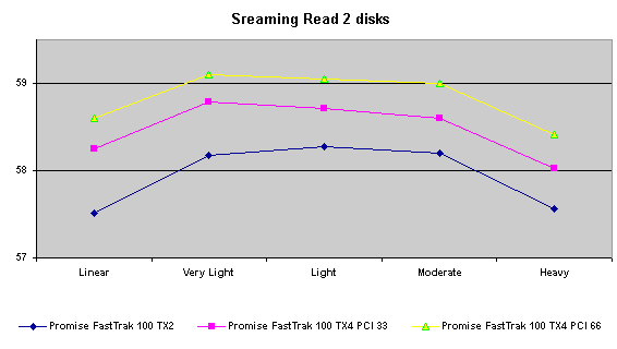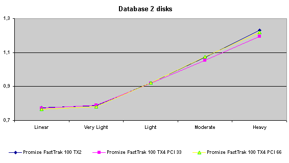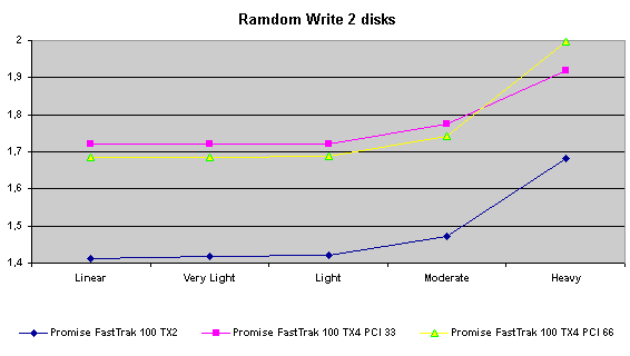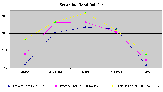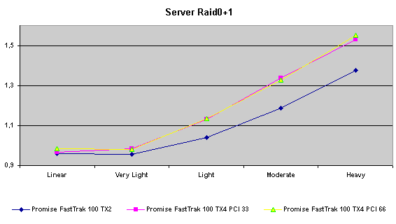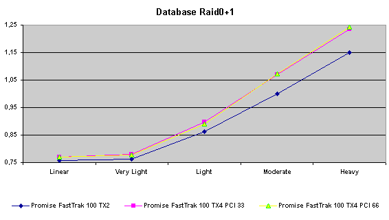 Действительно, Promise FastTrak100 TX4 дает выигрыш в режиме RAID0+1 по сравнению с «младшим братом». Этот факт плюс возможность «горячей» замены (которая отсутствует в двухканальных контроллерах) дает основания порекомендовать использовать при построении таких массивов именно этот контроллер.