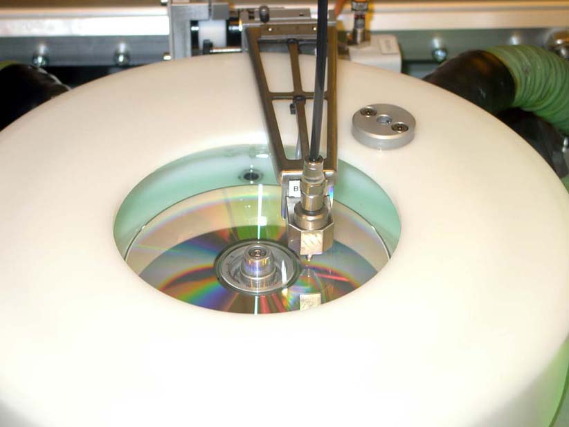 Следующий этап — нанесение слоя защитного лака поверхность. Он наносится примерно тем же способом, что и активный слой, то есть методом центрифугирования. При выполнении этой операции также очень важно соблюсти все необходимые требования. Лак обязательно должен закрывать края диска, чтобы предотвратить контакт dye и серебра с внешней средой.